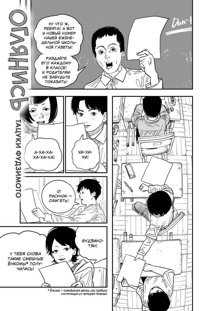 «Оглянись» — одно из лучших произведений Тацуки Фудзимото, автора таких популярных серий, как «Человек-бензопила» и «Огненный удар». Эта пронзительная и невероятно лиричная история о мечтах, утратах и неудержимом стремлении к совершенству заметно отличается от предыдущих работ автора, раскрывая новые грани таланта Фудзимото и подтверждая его статус одного из самых выдающихся мангак современности!