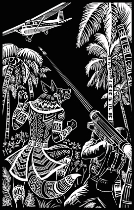 Ну и, конечно, какой же приключенческий роман без главного злодея! А злодей у Леонида Смирнова образцово-показательный. Целый полковник Кихунгебе, надутый спесью по самую макушку и возомнивший себя спасителем континента: «Я буду подниматься туда, где солнце ярче… Дорога трудна, ступеней у пьедестала власти много. Сначала — президент маленькой Гвинеи, затем — лидер революционного движения франкоговорящей Африки, потом – вождь всего Черного континента и в конце концов — Отец Третьего мира, спаситель мировой цивилизации от нравственного распада и хищников капитала. Так и только так».