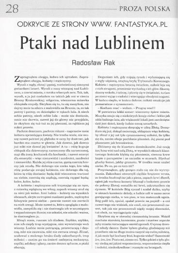 15.2. Опубликованный под дополнительной «плашкой» «Открытие с сайта www.fantastyka.pl» рассказ “Ptaki and Lublinom/Птицы над Люблином” написал Радослав Рак/Radosław Rak (стр. 28--32). Иллюстрации РАФАЛА ШЛАПЫ/Rafał Szłapa.