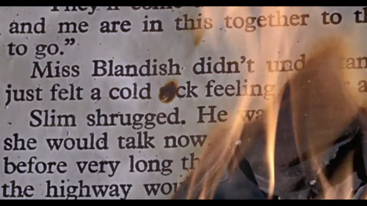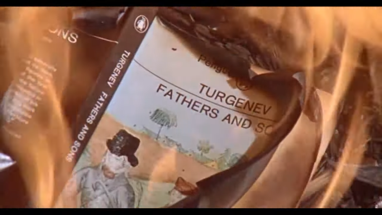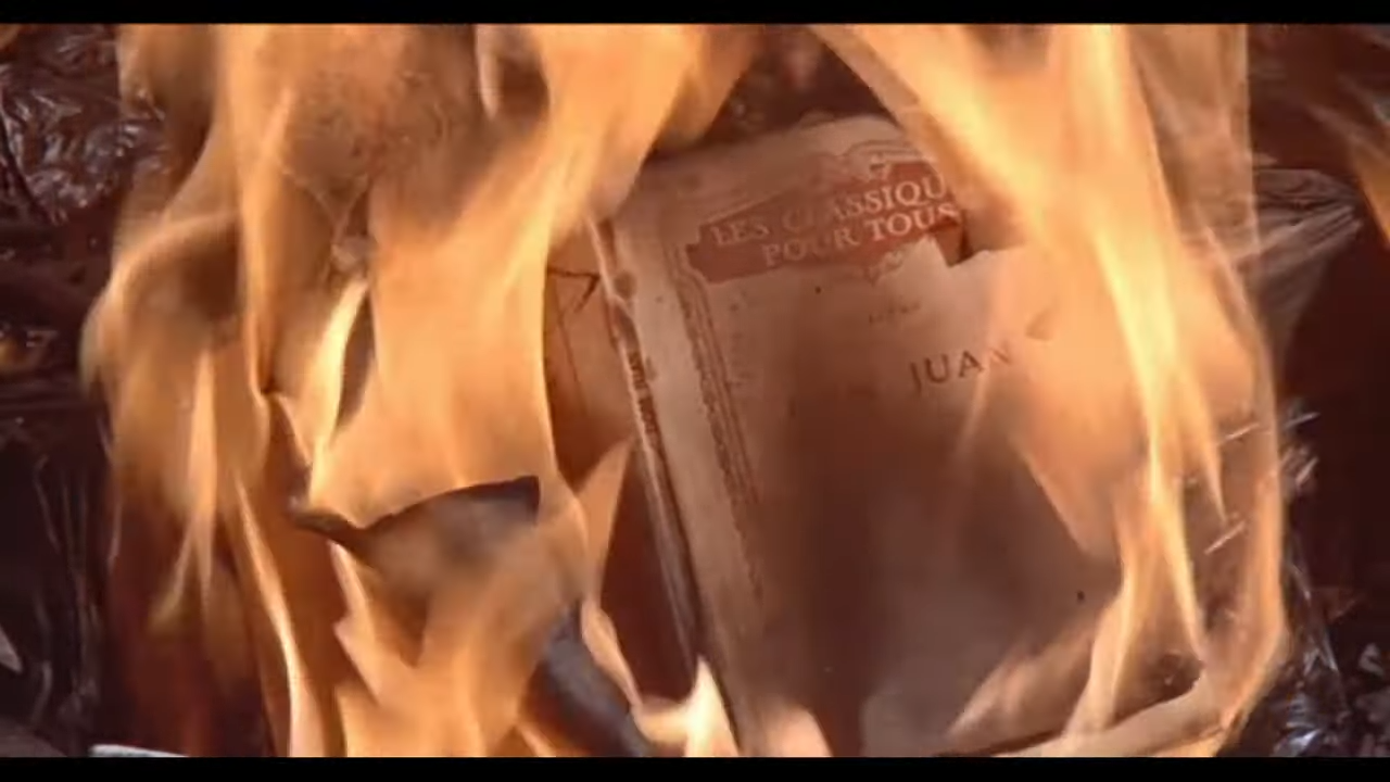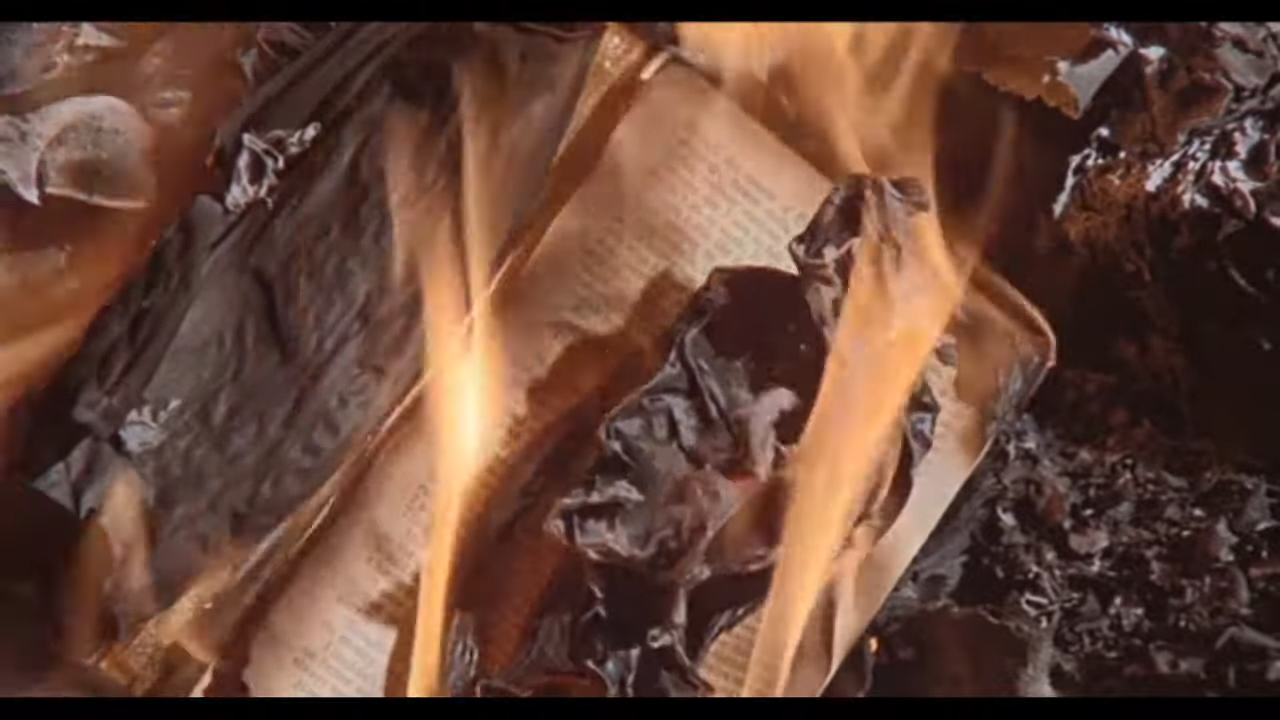 Это связано с интересной формальной процедурой, а именно с отсутствием обычной вступительной сцены фильма. Начало фильма полностью лишено букв – название фильма, фамилии режиссера, актеров и т.д. читаются вслух. Буквы появляются в фильме только в кадрах с горящими книгами.