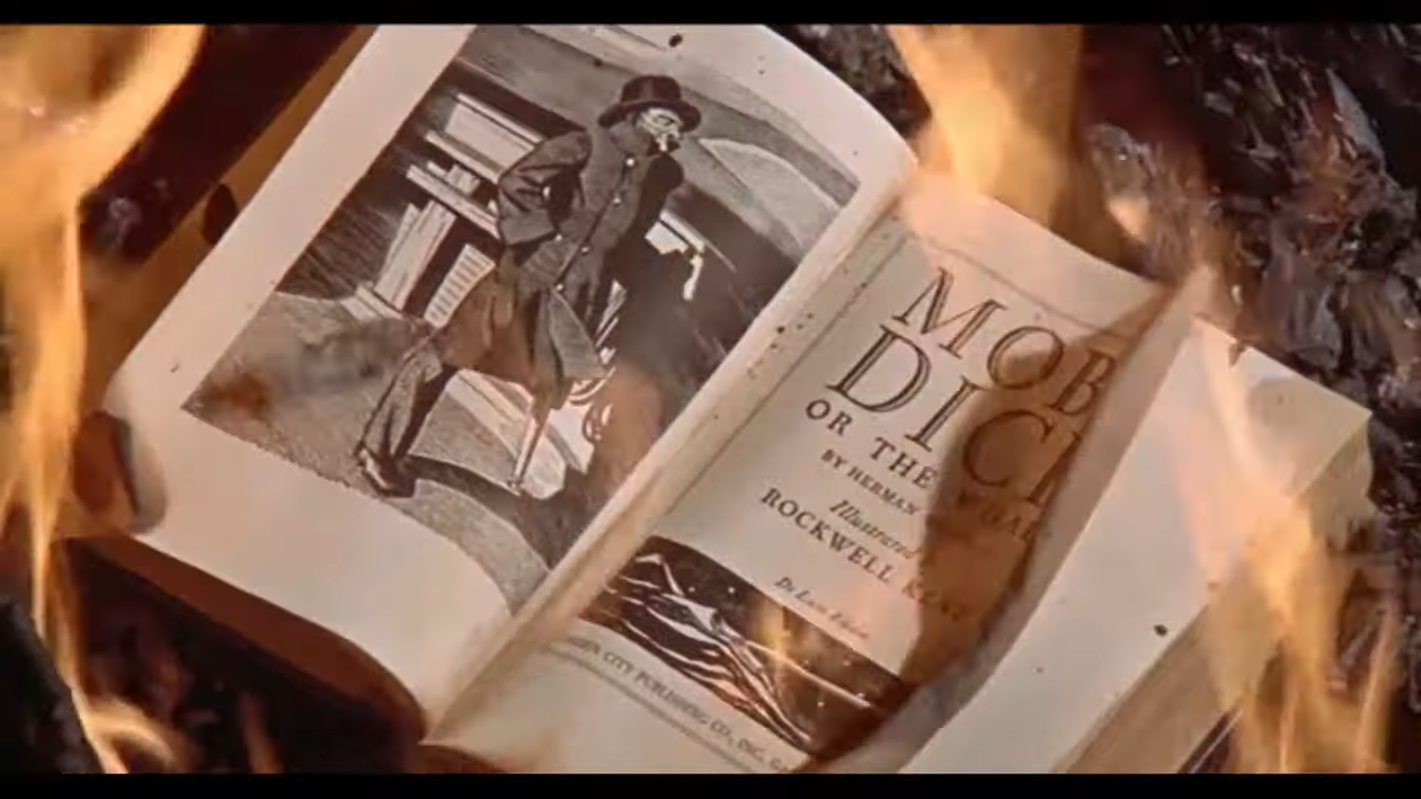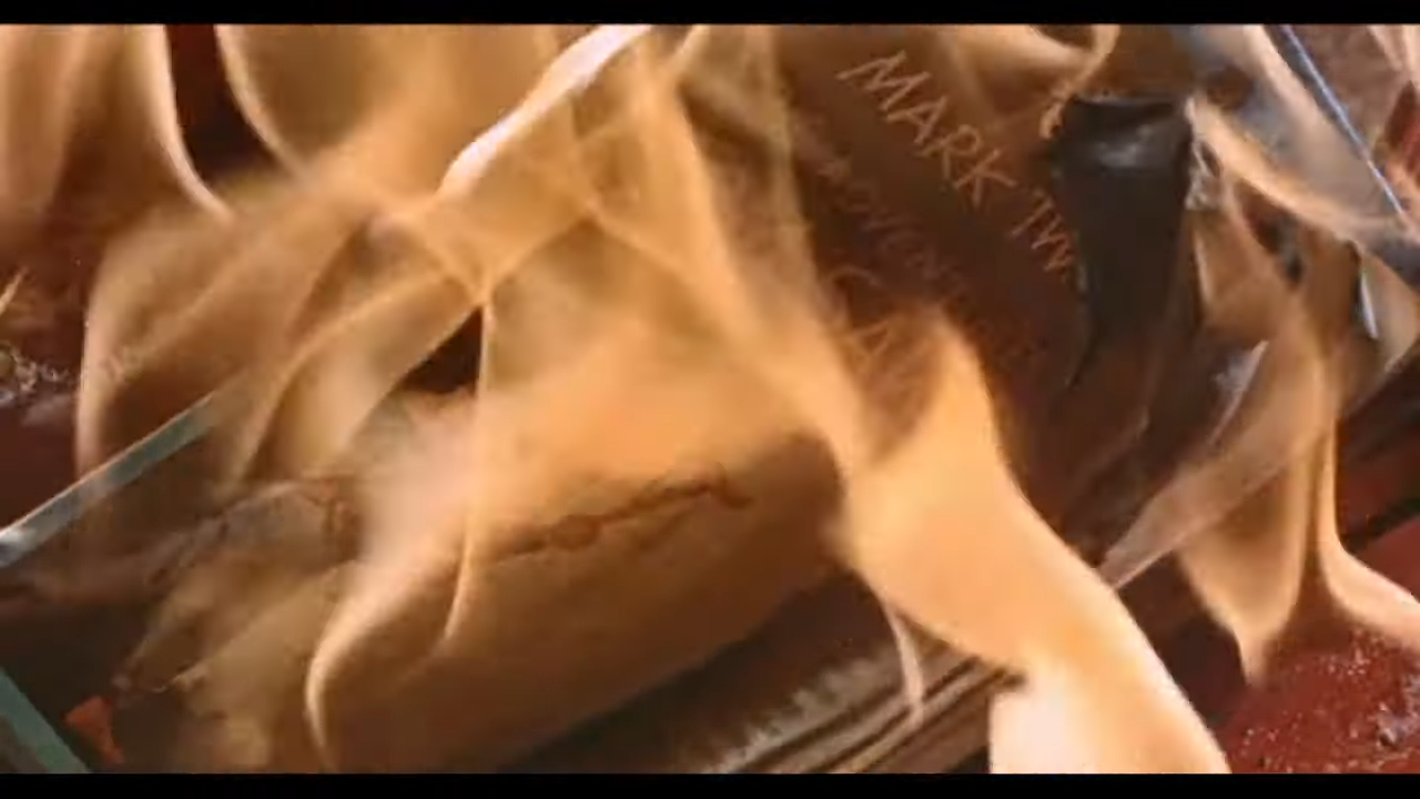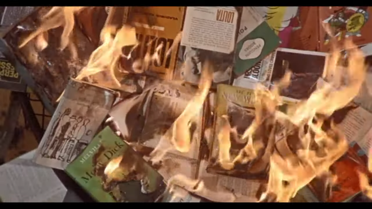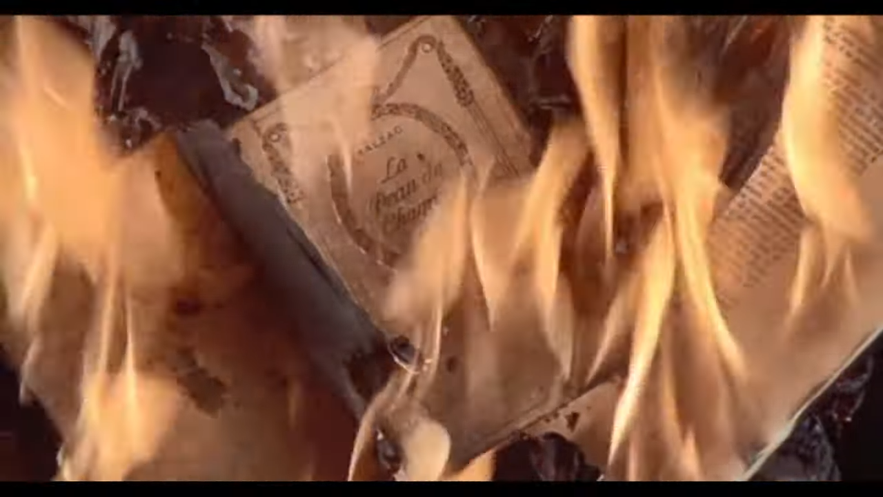 Это связано с интересной формальной процедурой, а именно с отсутствием обычной вступительной сцены фильма. Начало фильма полностью лишено букв – название фильма, фамилии режиссера, актеров и т.д. читаются вслух. Буквы появляются в фильме только в кадрах с горящими книгами.