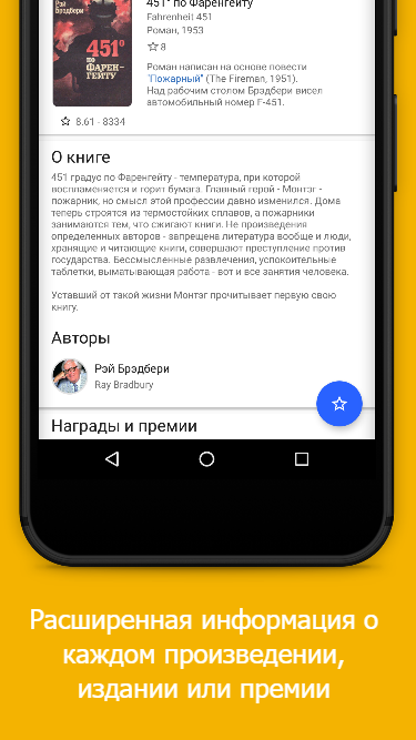 Пожалуй, о поиске стоит лишь сказать, что доступен одновременный поиск по авторам, произведениям, изданиям и наградам, а также поиск с помощью сканирования штрихкода ISBN.