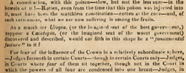 Слово «какотопия» в противовес «утопии» Томаса МОРА ввел Иеремия БЕНТАМ в 1817-м году в 13 главе «Плана парламентской реформы в форме катехизиса…». Имел он в виду, правда, не общество, которого нет, а общество, которое есть. Где закон позволяет представителям законодательной власти получать деньги от власти исполнительной: «Конституция с этим ядом в ее недрах! По образцу Утопии, предположим, что Какотопия обнаружена и описана, — не будет ли грязь в этой форме «фундаментальной чертой» в ней?». Вот это самое место в книге издания 1817 года: