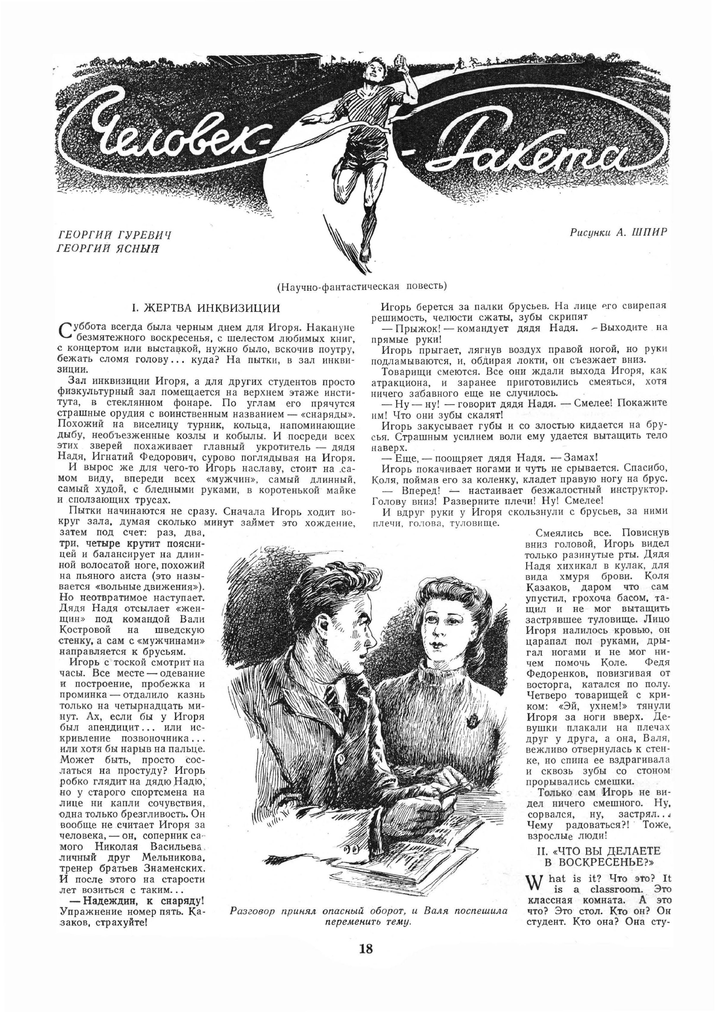 Проштудировав подшивку «Советского спорта», я обнаружил в номере от 9 апреля 1946 года рассказ Георгия ГУРОВА-ЯСНОГО «Два штрафных» — как раз об этом баскетбольном подвиге, где, кстати, в волнениях героя немалую роль сыграла девушка Ляля (в «Человеке-ракете» все спортивные переживания главного героя из-за девушки Вали).
