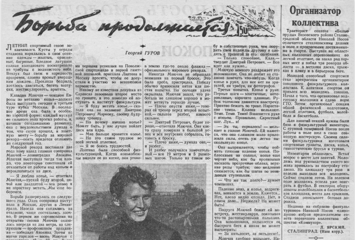 Правда, в 1948 году в Москве в издательстве «Физкультура и спорт» вышел сборник спортивных очерков «Победители», составленный Георгием ЯСНЫМ. В него вошли один самостоятельный очерк Георгия ГУРЕВИЧА «Борьба продолжается» (о золотой медалистке чемпионата Европы по легкой атлетике 1946 года и первой в истории женщине, метнувшей копье дальше пятидесяти метров, Клавдии МАЮЧЕЙ) и два совместных