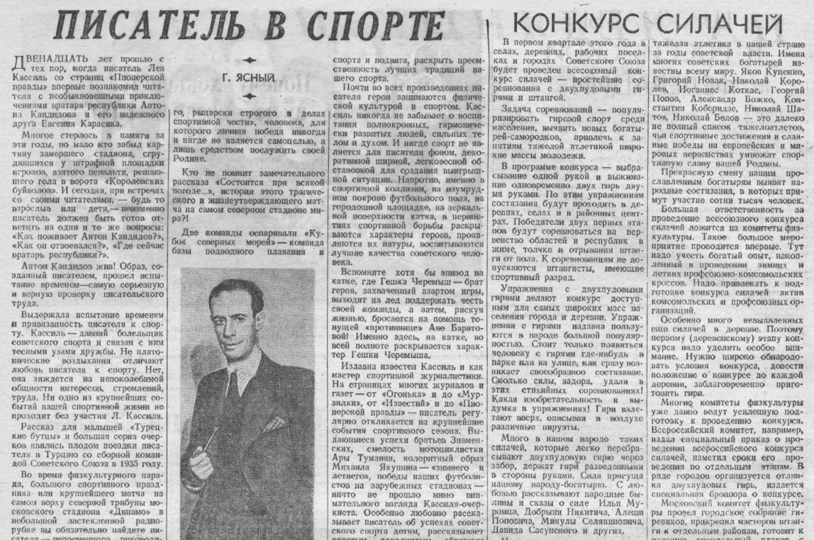 Георгий ЯСНЫЙ под своей собственной фамилией тоже печатался в «Советском спорте». Вот, например, его очерк о Льве КАССИЛЕ из №3 от 10 января 1948 года.