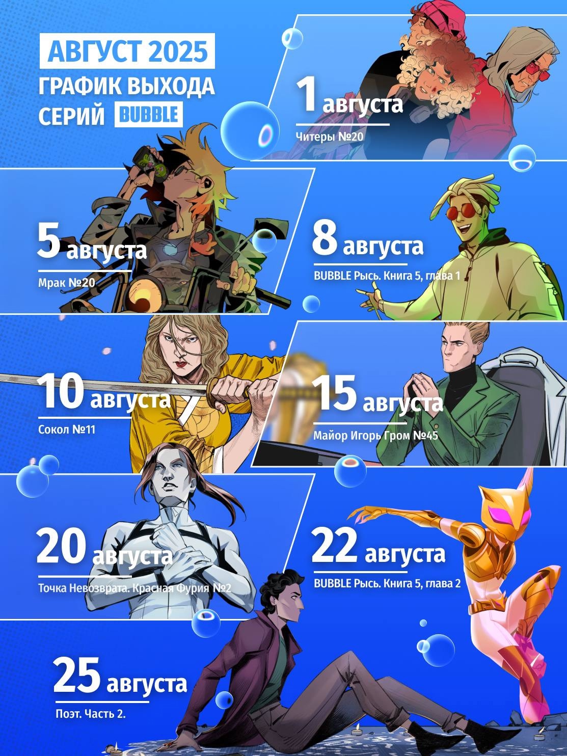 Июль начнётся с новых глав «4итеров» и «Мрака». Затем мы вновь отправимся в путешествие сквозь время и пространство в комиксе «Сокол», а уже на следующий день выйдет первый спецвыпуск нашего вебтуна «BUBBLE Рысь», посвящённый Свартжель.