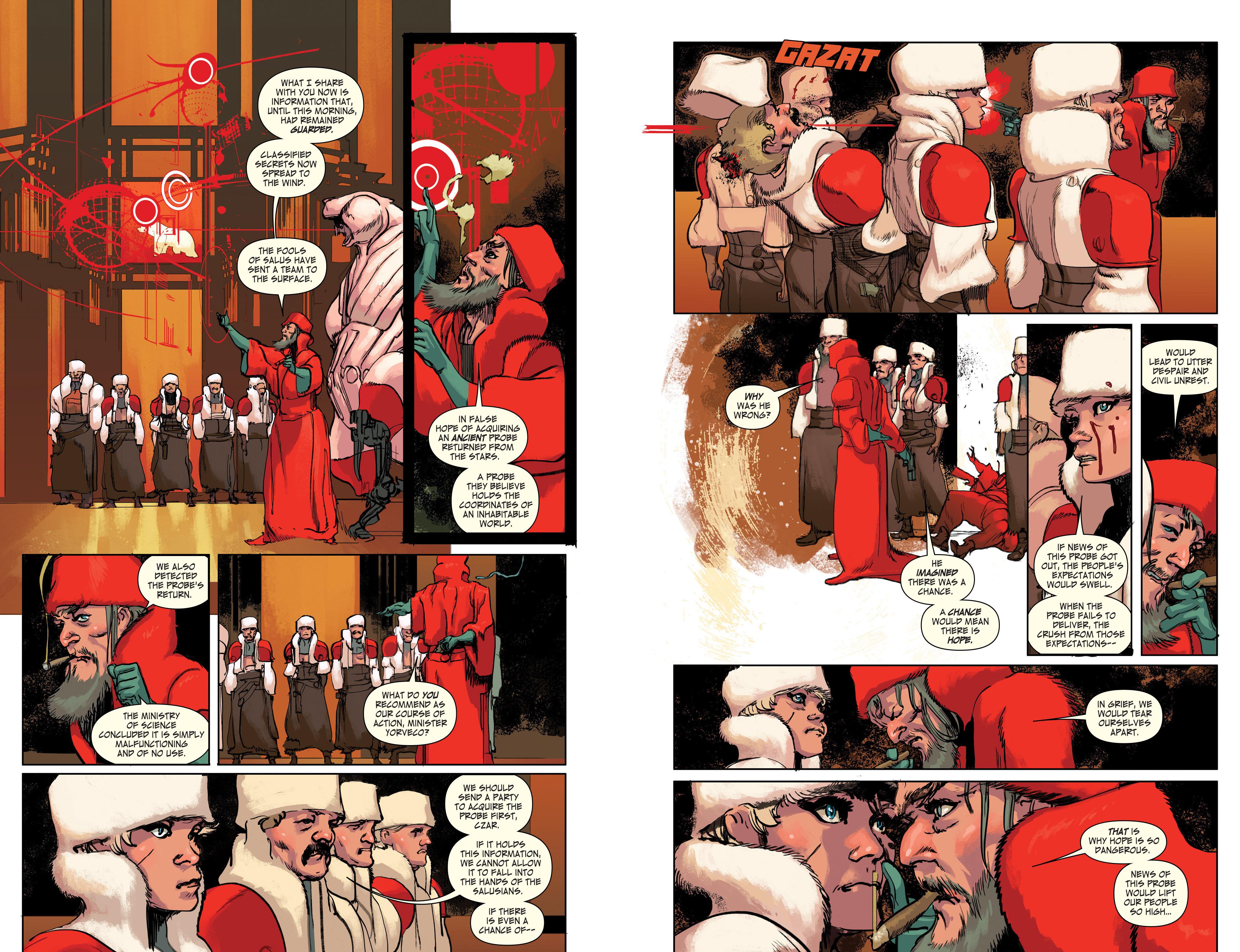 Вторая глобальная проблема комикса и по совместительству достаточно общая черта многих серий Image, что они как сериалы Netflix. Слишком авторские и без адекватного контроля, поэтому там может твориться всё что угодно. Никто не похлопает по плечу и не скажет «так нельзя». Поэтому у них всегда крайне красивое и увлекательное начало, которое потом зачастую скатывается по всем параметрам. Например, первые 8 выпусков «Дна» художник Грег Токкини старательно красил в собственной манере, и это было круто. К девятому, похоже, он понял, что ничего не успевает, и к команде присоединился колорист. Качество рисунка резко просело. А к концу серии и сам Токкини начал халтурить, поэтому местами рисунок то сверкает большими белыми полями, то превращается в жуткое месиво. С сюжетом та же беда. Любопытная идея о далёком будущем, где люди спасаются от увеличившегося солнца в куполах на дне океана без какой-то надежды на спасение, очень быстро без объяснений начинает пестреть всевозможными клише жанра, новыми фантастическими существами, бросающими вызов логике, и несуразными сюжетными поворотами на ровном месте. Мои любимчики, собравшие самое идиотское бинго — жители купола Волдин. Они даже под водой ходят в меховых шапках и шубах, используют кибернетические летающие боевые машины в виде медведей, почтительно именуют своего лидера Царь и калёным железом выжигают любые признаки культуры, дающие «ложную» надежду. Очаровашки, одним словом.