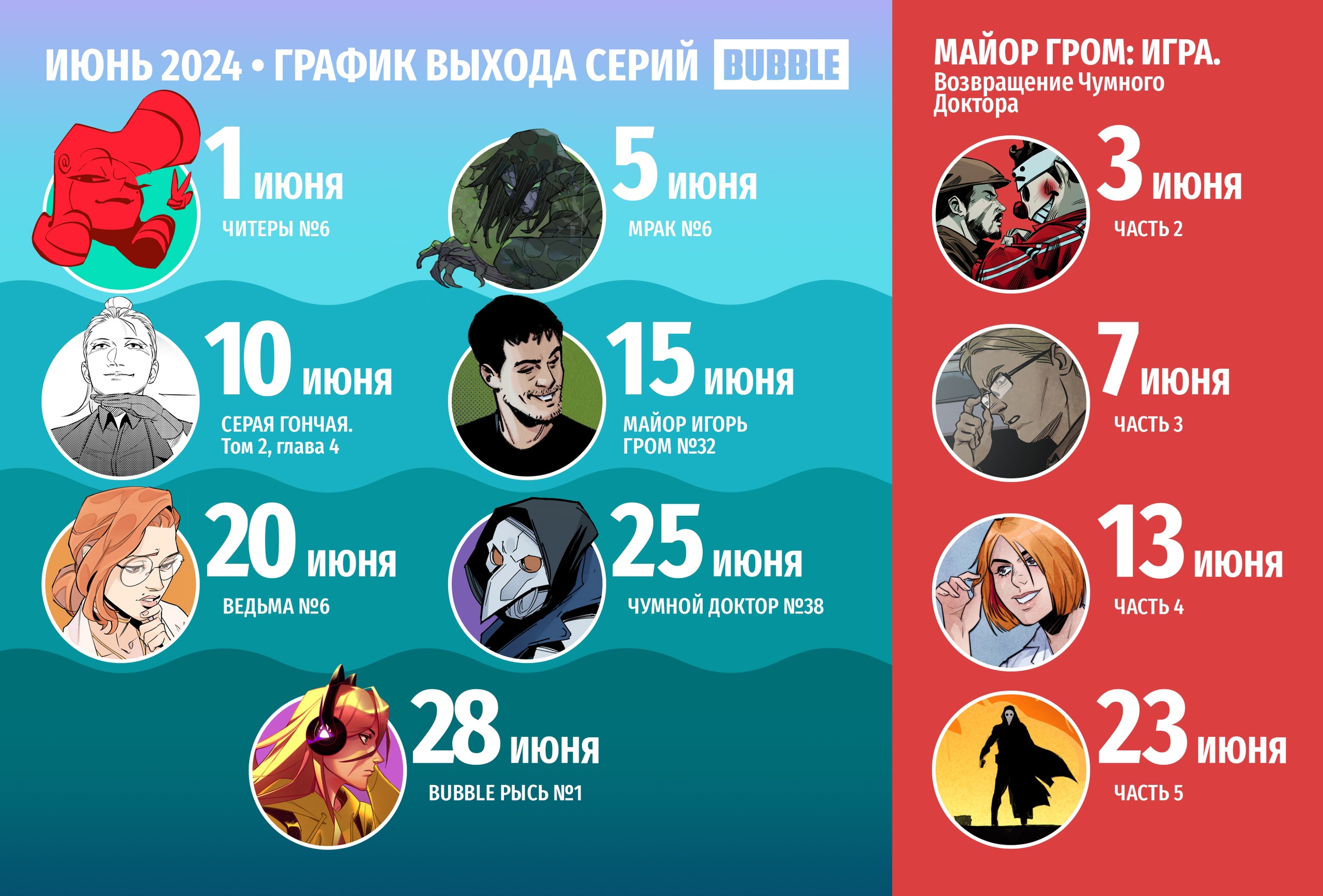 В июне вас ждёт ОЧЕНЬ много электронных новинок. Тут и продолжение таких серий, как «4итеры», «Мрак», «Майор Игорь Гром», «Ведьма» и «Чумной Доктор», и оставшиеся части кинокомикса о возвращении Чумного Доктора, и новый выпуск нашей манги-антиутопии «Серая Гончая», и… долгожданный первый выпуск нашего нового вебтуна «BUBBLE Рысь»!