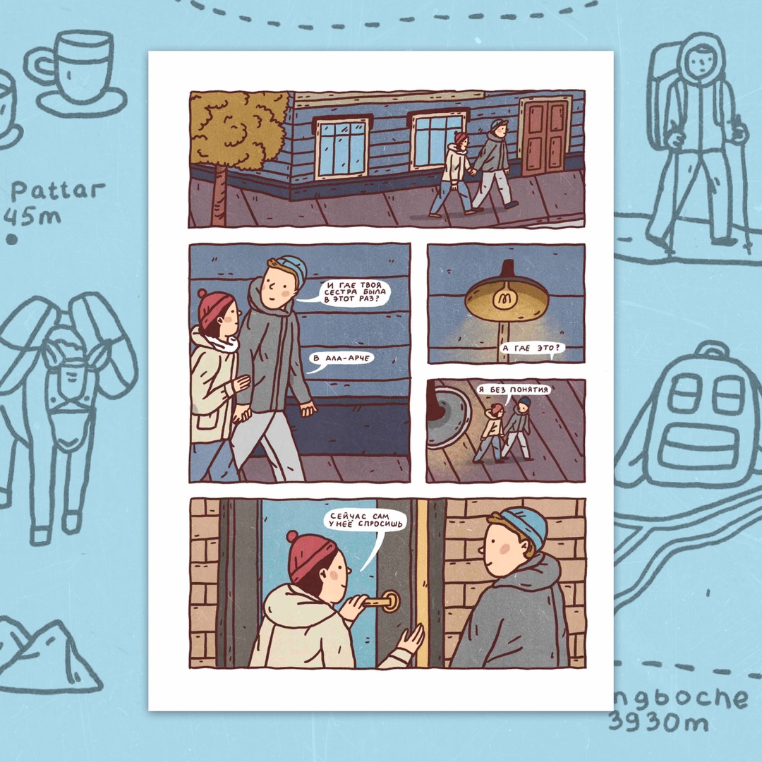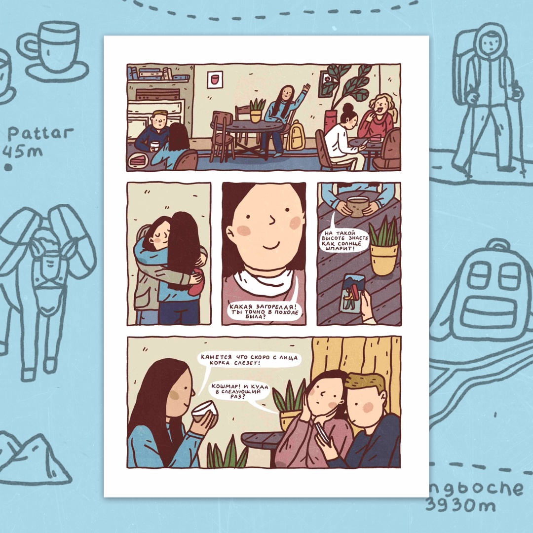 Представляем вашему вниманию комикс-дневник художницы Саши Миткаловой о её путешествии к базовому лагерю Эвереста на высоте более пяти тысяч метров! История о том, как обещанная лёгкая прогулка превратилась в одно из сложнейших испытаний в жизни. Но здесь даже самые тяжёлые и изматывающие моменты сопровождаются самыми невероятными пейзажами.