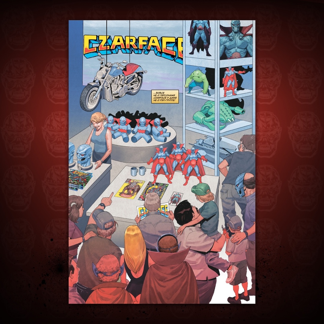 «Получается, комикс про рэперов?» — недоумённо вопрошает читатель. «А вот и нет!» — восклицаем мы. Ни про Czarface, ни про Царя из немецкой сцены нулевых (жаль, да). Эта история о маскоте группы, антигерое, созданном с оглядкой на Росомаху и названном намеренно созвучно с «Лицом со шрамом» (Czarface / Scarface). А написал сценарий не кто иной, как сам Esoteric, один из основателей коллектива.