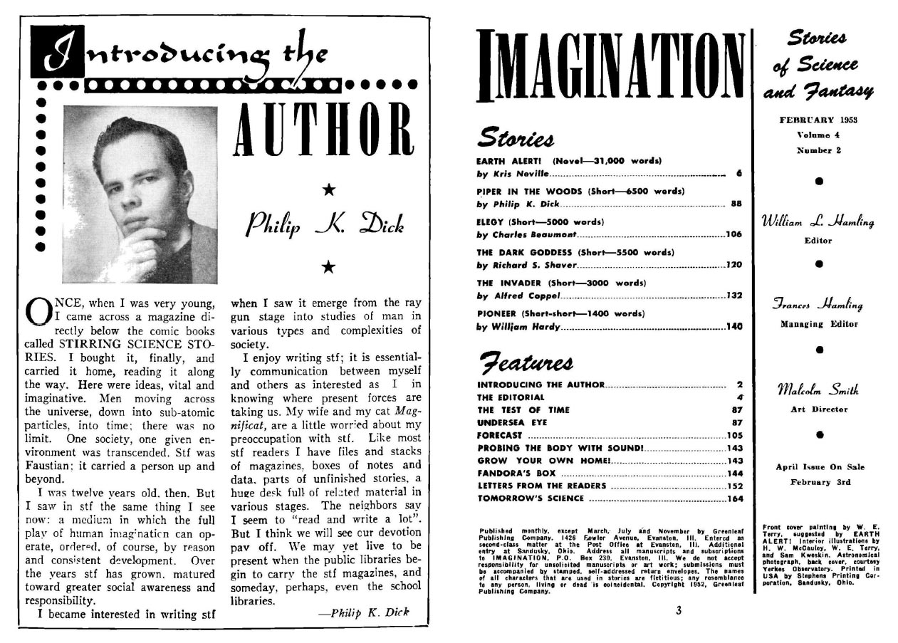 Тринадцатью годами ранее Дик рассказал читателям «Имэджинейшн», что случайно наткнулся на выпуск «Волнующих научно-фантастических рассказов» и был очарован. «Там были идеи, насущные и воображаемые. Люди путешествовали в пространстве и во времени, и не было никаких границ, — пишет он, добавляя: — Мне доставляет истинное удовольствие писать научную фантастику; главным образом, это общение между мною и другими, которым, также как и мне, интересно узнать, куда нынешние силы увлекут нас… Возможно, мы еще доживем до тех времен, когда в публичных библиотеках будут научно-фантастические журналы, а однажды, быть может, и в школьных библиотеках».