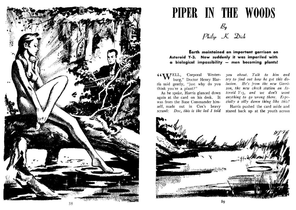 Обложка этого номера журнала, представление нового автора на стр.2, и иллюстрация без подписи художника, к рассказу "Piper in the Woods" (рус.перевод: Дудочники)