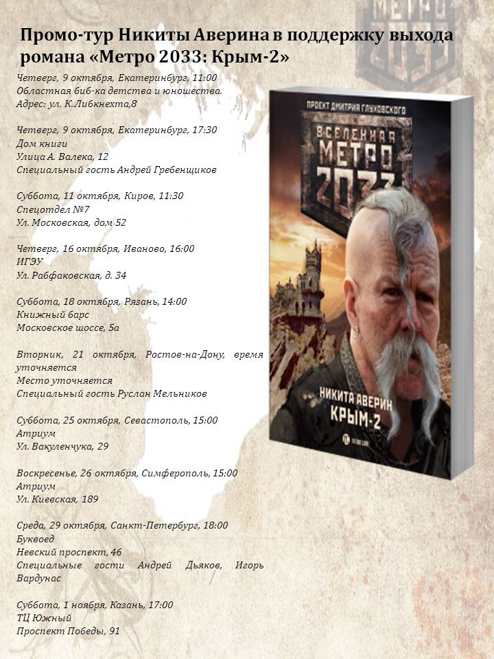 В честь выхода в свет романа "Метро 2033: Крым-2" писатель Никита Аверин отправился в тур по городам и весям. В минувшее воскресенье он побывал в Москве, а дальше его ждет еще как минимум 10 мероприятий в самых разных частях страны.
