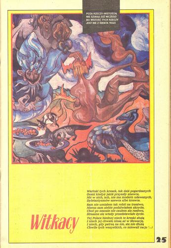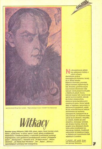 Августовский номер третьего подписного года «Фантастыки» делает та же команда, которая делала предыдущий номер. Адрес тот же, те же два телефонных номера. Объем журнала, бумага, типография – все те же. Tираж – 132 тысячи экземпляров. Поскольку значительная часть материалов номера посвящена польскому писателю, поэту, художнику (и пр. и пр.) Станиславу Игнацию Виткевичу (Виткацию)/Stanisław Ignacy Witkiewicz (Witkacy) (1885 – 1939), в «Галерее» представлены его работы, выполненные в стиле экспрессионизма (весьма, надо сказать, своеобразного). Репродукции его работ размещены на первой странице передней обложки, а также на страницах 7, 15, 25, 39, 45, 48 и в тексте соответствующих статей на страницах 58, 59. На второй странице задней обложки размещена иллюстрация к публикуемой в номере повести В. Ешке «Король и кукольник» (художник АНДЖЕЙ БЖЕЗИЦКИЙ). Художественное оформление журнала МАРЕКА ЗАЛЕЙСКОГО и АНДЖЕЯ БЖЕЗИЦКОГО.