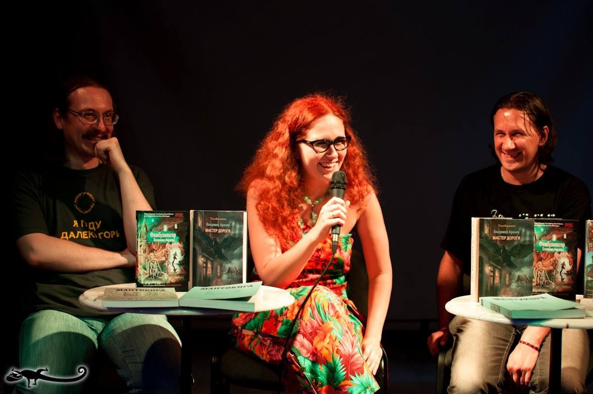 На презентации организатор модератор этих встреч, Виктория Нарижная, пытала нас о новых книгах и новых проектах, об истории "ЗФ" и проч., и т.д.; вдобавок мы с Олегом почитали фрагменты рассказов/романа.