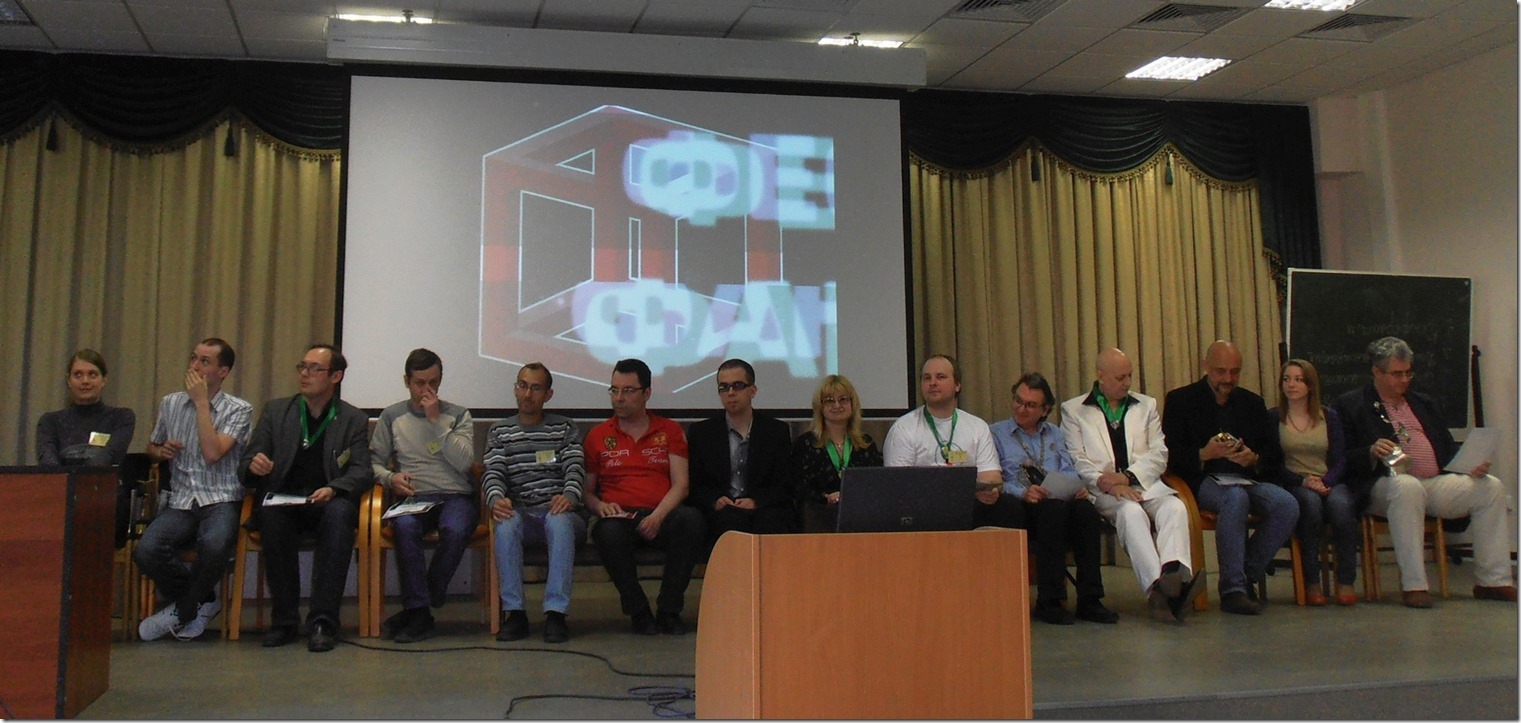 Выступает Володя Аренев с докладом о фэнтези, которого не было — о книгах Костецкого, Нестайко, Почепцова (и кого-то ещё). Доклад тоже завершился бурным обсуждением, на этот раз определения фэнтези.