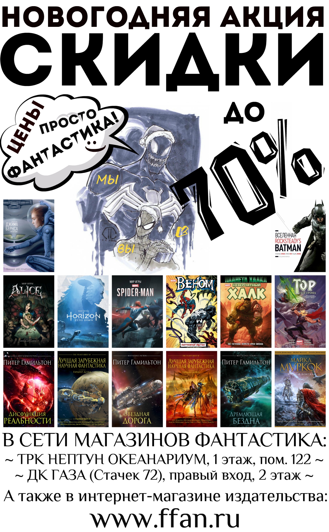 Начиная с сегодняшнего дня и до конца года в магазинах сети ФАНТАСТИКА (ТРК Нептун Океанариум и ДК Газа), а также в интернет-магазине ffan.ru вас ждут скидки до 70% на избранные издания нашего издательства: