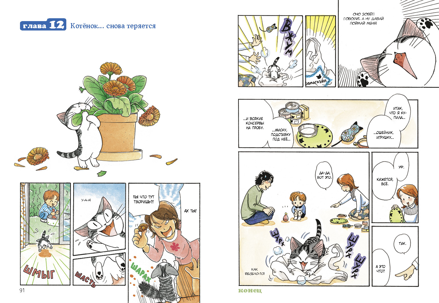 2. "Милый дом Чи" издан по всем законам манги, то есть читать книгу надо справа налево. Это имеет отношение как к порядку чтения страниц, так и к порядку чтения отдельных кадров на страницах. Сюжет в манге о котике чрезвычайно простой, потому будет легко и просто привыкнуть к непривычной для европейца манере чтения, если появилось желание узнать, что за зверь такой манга. Книга вполне может стать "базовым учебником" по основам правильного чтения манги.