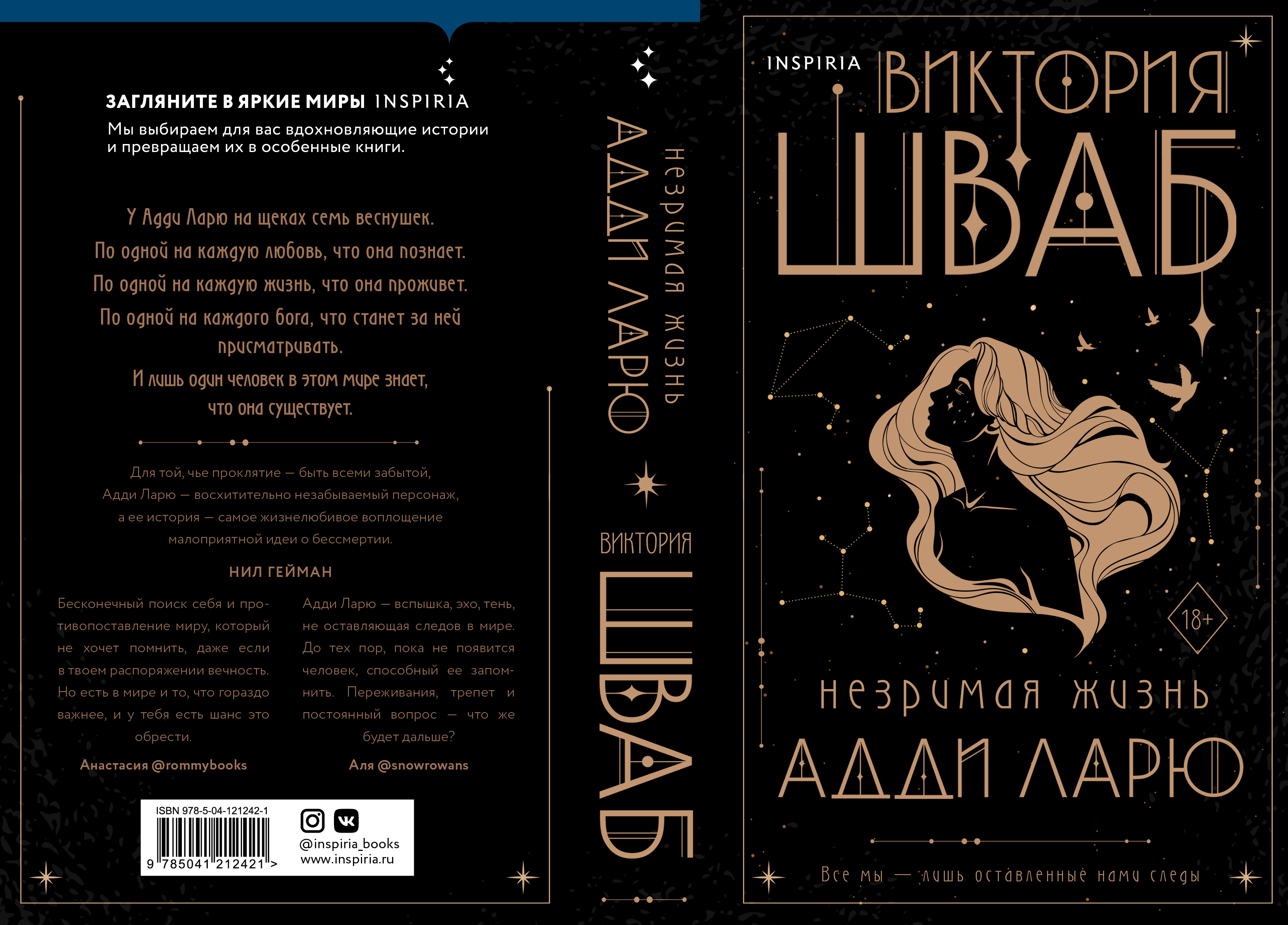 Под брендом Inspiria вышел роман Виктории Шваб"Незримая жизнь Адди Ларю", рассказывающий о девушке, которая заключила фаустовскую сделку — получила бессмертие, но оказалась обречена быть забыта всеми, кого встречает. Она живет уже многие века, отчаянно стремясь оставить свой след в истории (и находя для этого способы), пока не встречает книжном магазинчике Нью-Йорка того, кто оказывается способен ее запомнить.