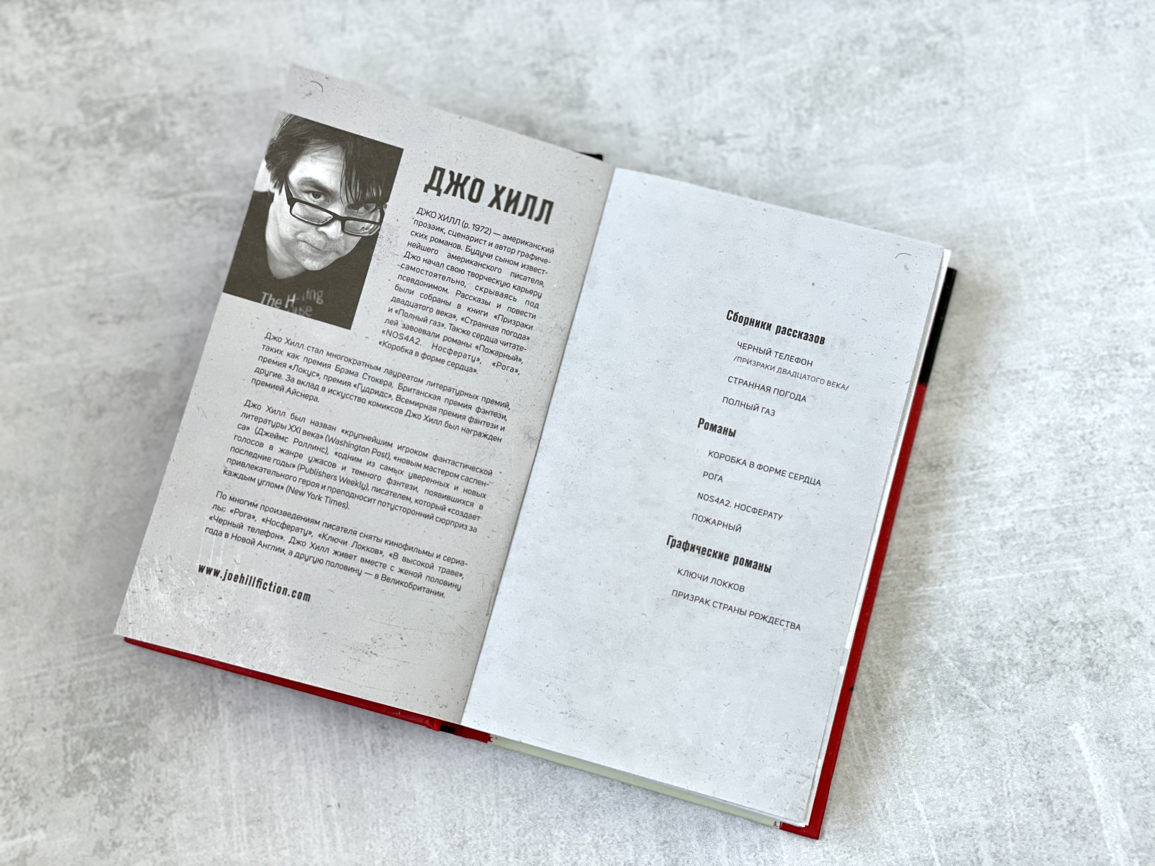Джо Хилл (р. 1972) — американский прозаик, сценарист и автор графических романов. Будучи сыном известнейшего американского писателя, Джо начал свою творческую карьеру самостоятельно, скрываясь под псевдонимом. Рассказы и повести были собраны в книги «Призраки двадцатого века», «Странная погода» и «Полный газ». Также сердца читателей завоевали романы «Пожарный», «NOS4A2. Носферату», «Рога», «Коробка в форме сердца». Джо Хилл стал многократным лауреатом литературных премий, таких как премия Брэма Стокера, Британская премия фэнтези, премия «Локус», премия «Гудридс», Всемирная премия фэнтези и другие. За вклад в искусство комиксов Джо Хилл был награжден премией Айснера.