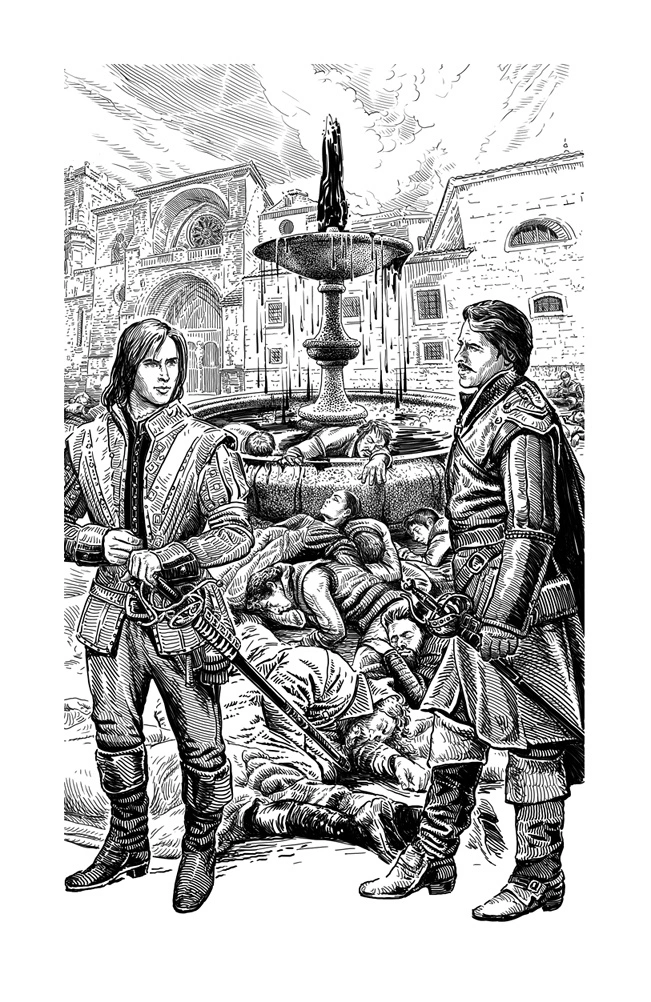 Такой знакомый мир, такой понятный... Всесильный кардинал и страдающая королева. Юный провинциал на нелепой лошади и рожденный в изгнании прекрасный принц. Непобедимый мерзавец и убежденная в своем уродстве красавица. Вороватый злобный пьянчуга и мудрый наставник. Такой знакомый мир, такой понятный... Призрачные монахи, призрачная башня, призрачная корона, яд, золото и сталь. На кону – родовое кольцо, на кону — победа, на кону — жизнь и смерть. Одна пуля гасит три свечи. Один вызывает семерых. Льется вино, льется кровь, льется песня... Такой знакомый мир, такой понятный. Но нет ничего туманней очевидности и тише крика.