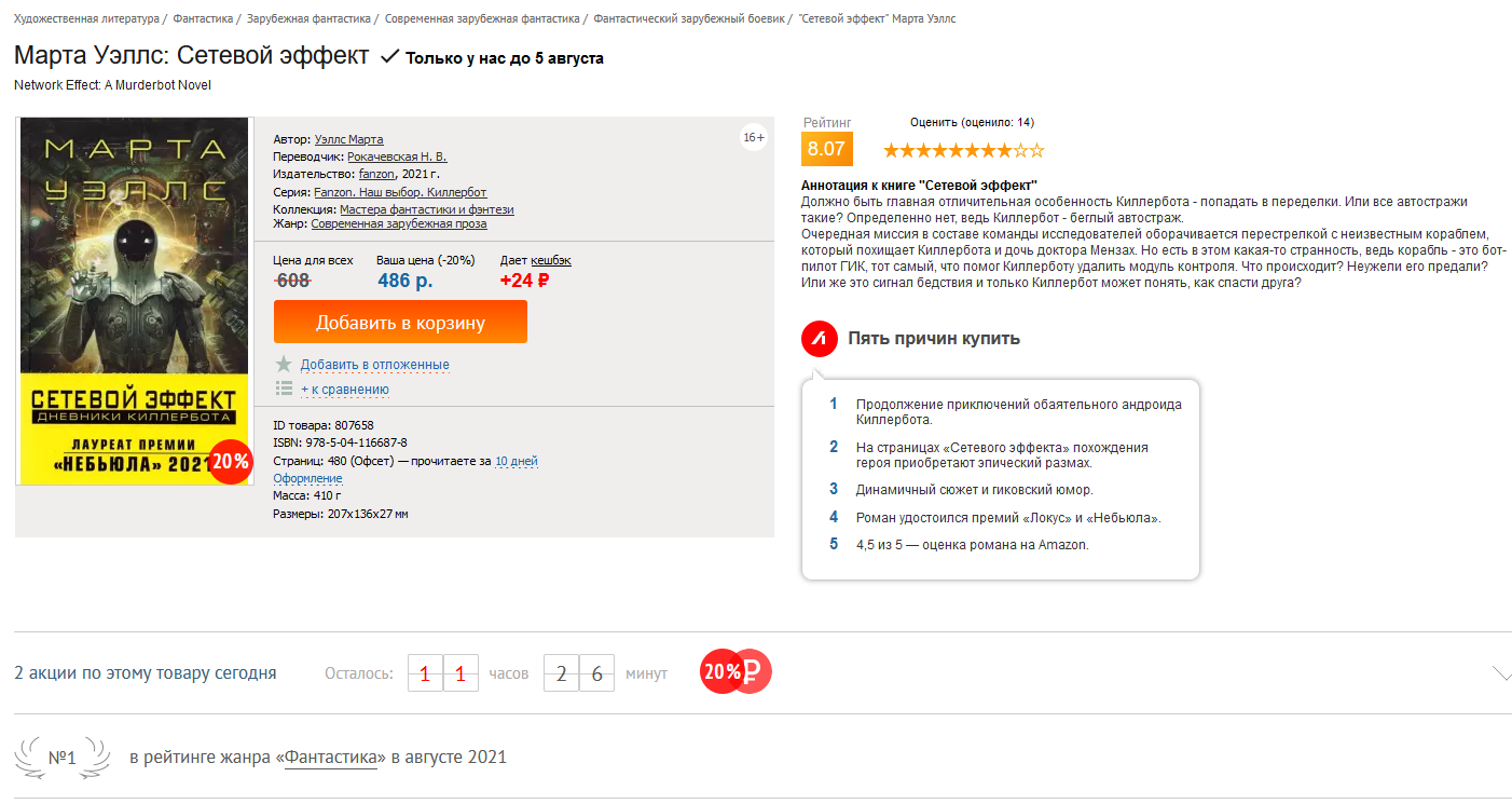 Две недели назад "Сетевой эффект", первый роман Марты Уэллс об анроиде-интроверте Киллерботе, начал продаваться эксклюзивно в "Лабиринте". В нем книга за считанные дни достигла первого места по продажам в нише "Фантастика" в июле, и продолжает удерживать позицию и в августе.