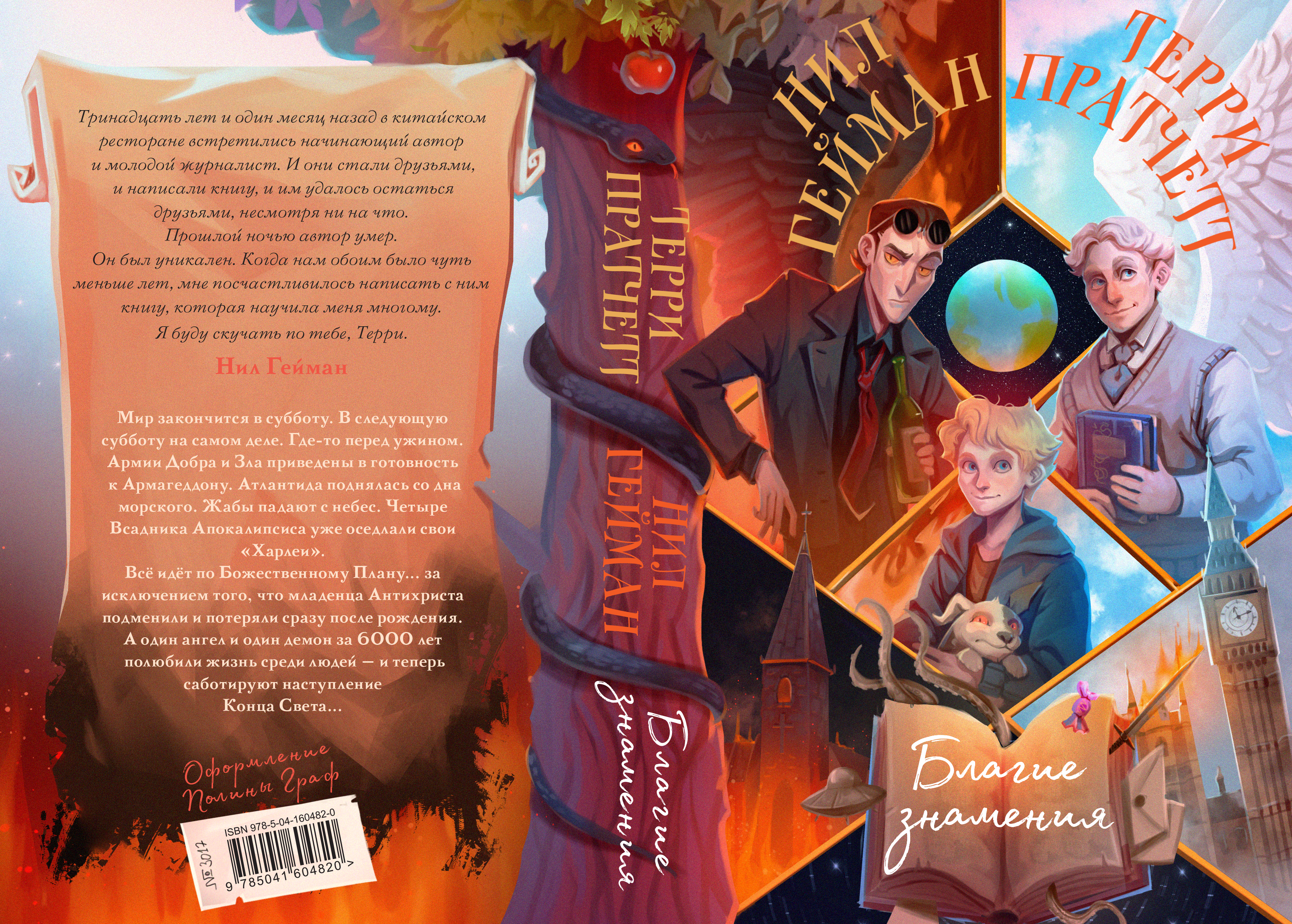 В октябре в серии "Магия Терри Пратчетта в иллюстрациях Полины Граф" выйдет переиздание романа "Благие знамения", и мы готовы показать, как будет выглядеть обложка книги. Будут цветная иллюстрация на обороте форзаца и чб картинки в тексте.