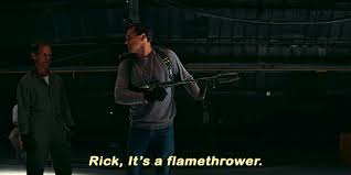 То, что Клифф Бут "под кислотой", то что степень жестокости и гуро далеко зашкаливает за любой реализм, то как неожиданно для меня (но совершенно логично в фильме) был использован пёсик Бута, то что Далтон ВНЕЗАПНО (но совершенно логично в фильме) решил использовать свой "наци-сжигатель" — все это как-то так смешно, так очаровательно, так хорошо снято.