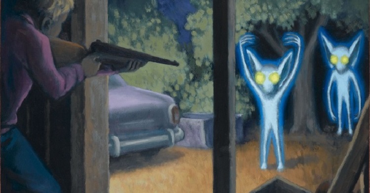 Спустя час собака Саттонов стала проявлять признаки беспокойства — лаяла и с опаской вглядывалась куда-то вдаль. Нравы в американской глубинке царили простые: сначала стрелять, а уже после спрашивать, кто идёт. Билл Тейлор и Элмер Саттон, вооружившись винтовками, вышли во двор, чтобы выяснить, что же там такое происходит.