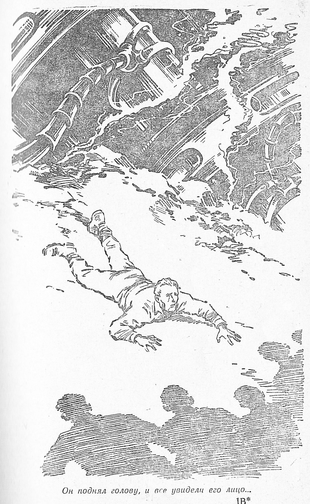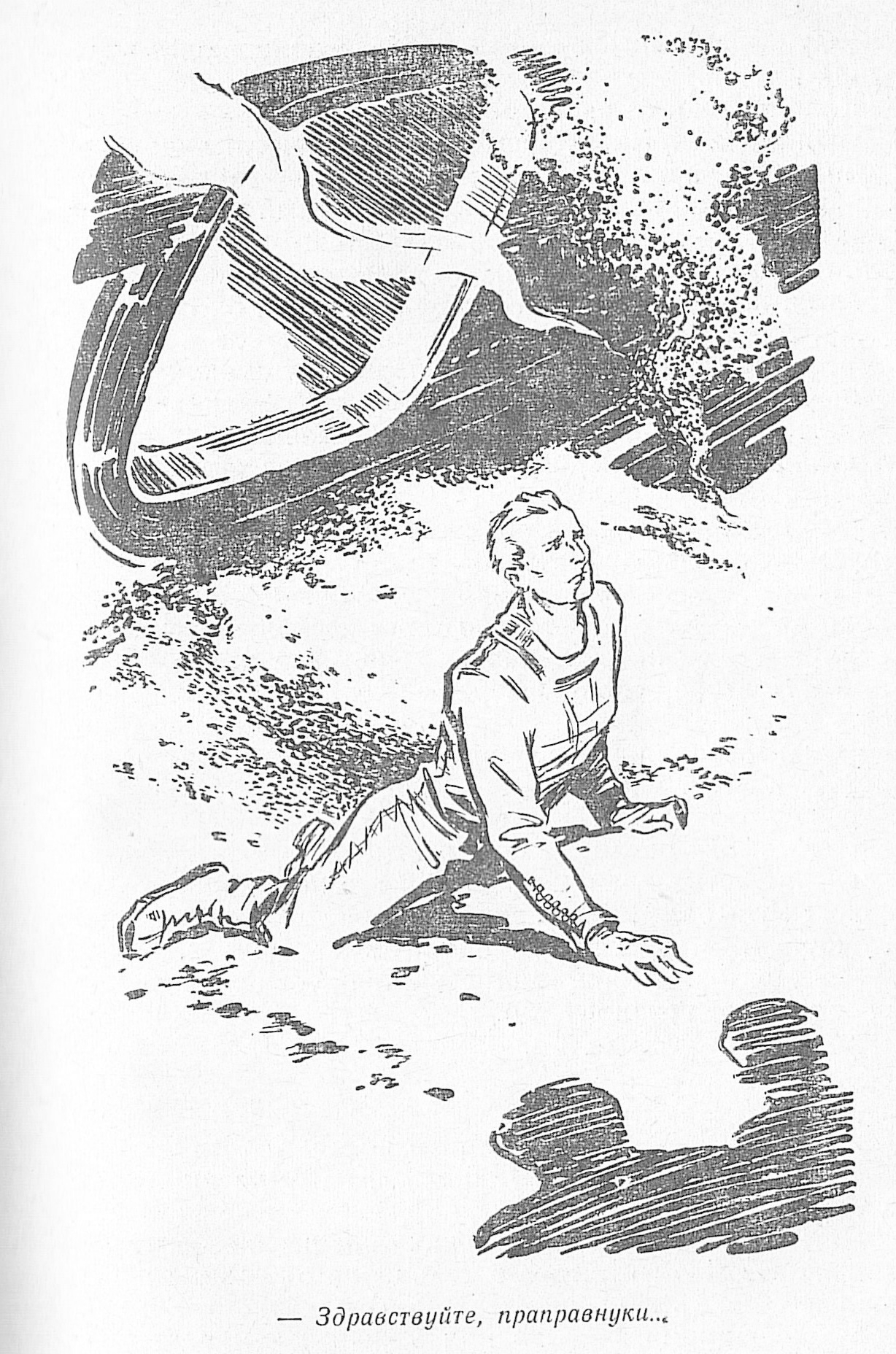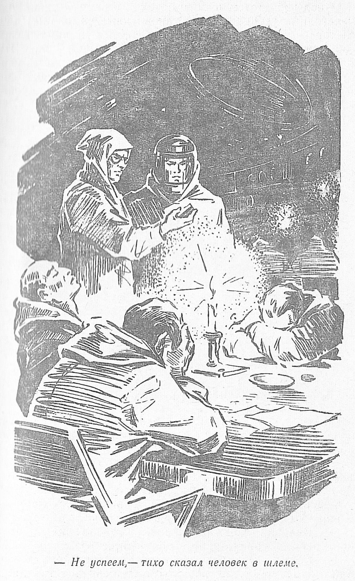 Две следующие иллюстрации выглядят как кадры одного дубля. Не забываем, что обе нарисовал Юрий Георгиевич Макаров. "Здравствуйте, праправнуки..." — произносит Евгений Славин и без сил падает.