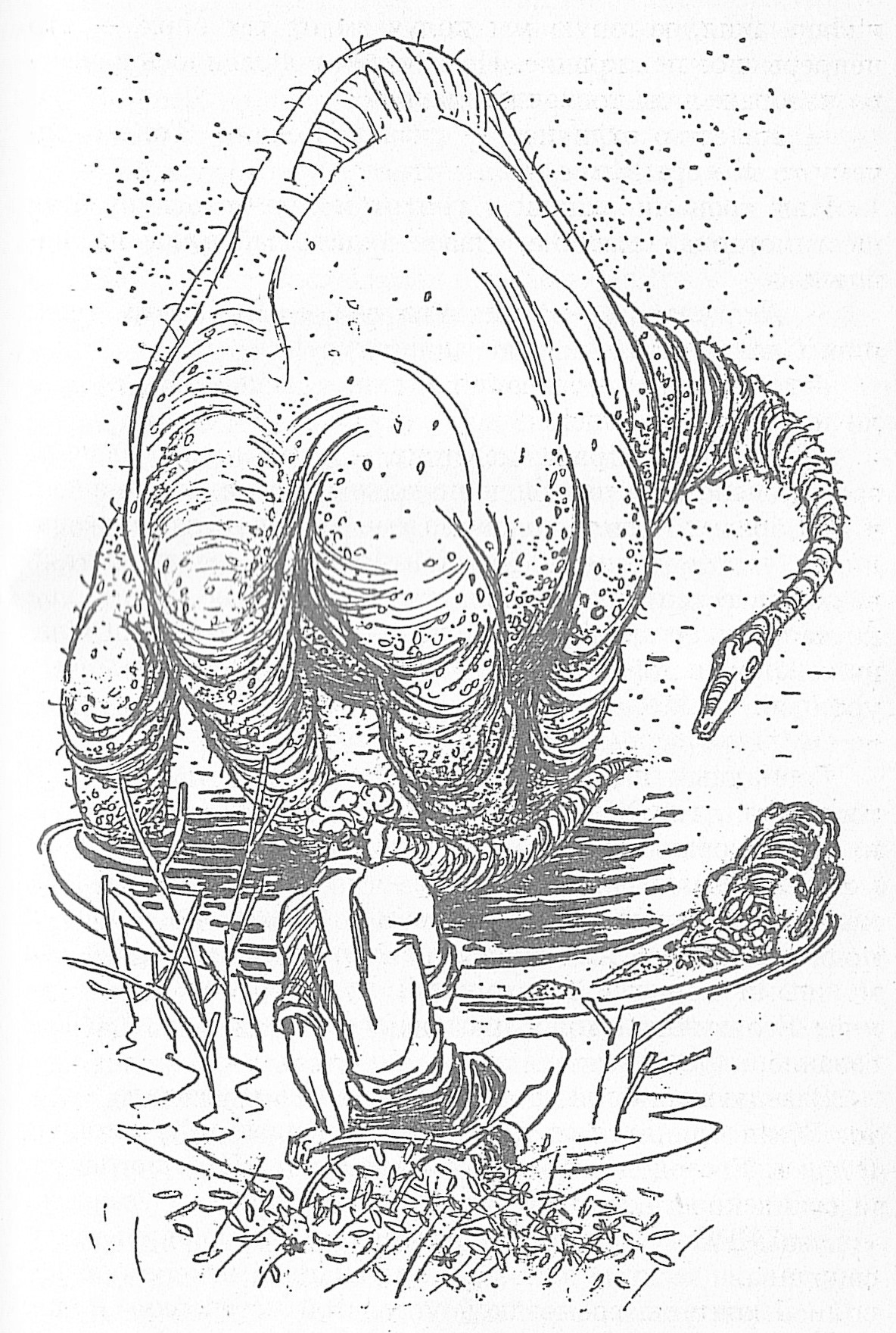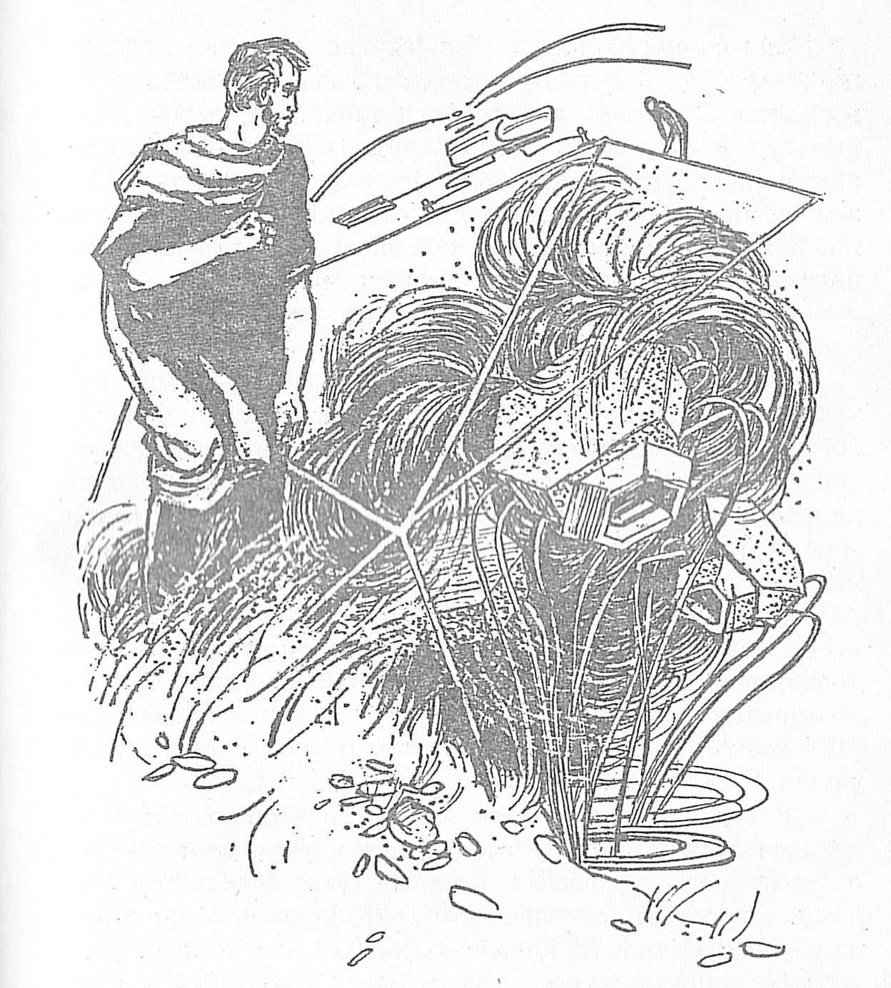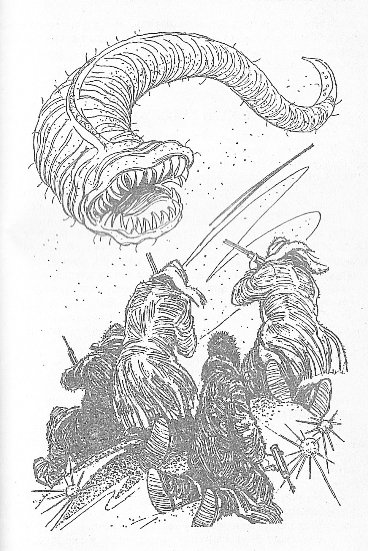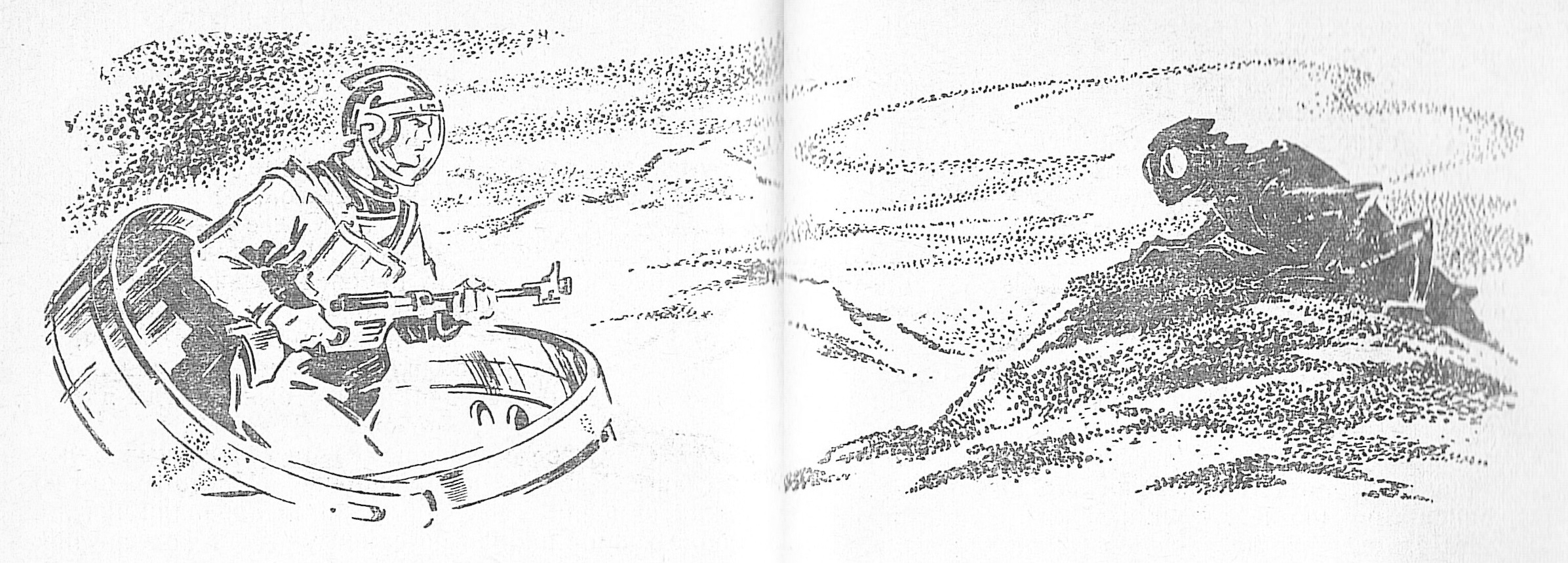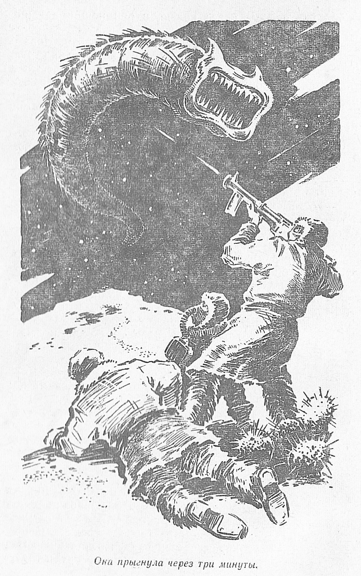 Марсианская летающая пиявка, с которой пришлось сразиться группе врачей и следопытов, на обоих рисунках практически одинакова, однако почему она нападает слева? Ведь только что обсуждали, что жуткая тварь всегда подбирается только справа. Авторы писали об этом неоднократно — и в "Полдне", и в "Стажёрах". Впрочем, возможно, просто ракурс такой.