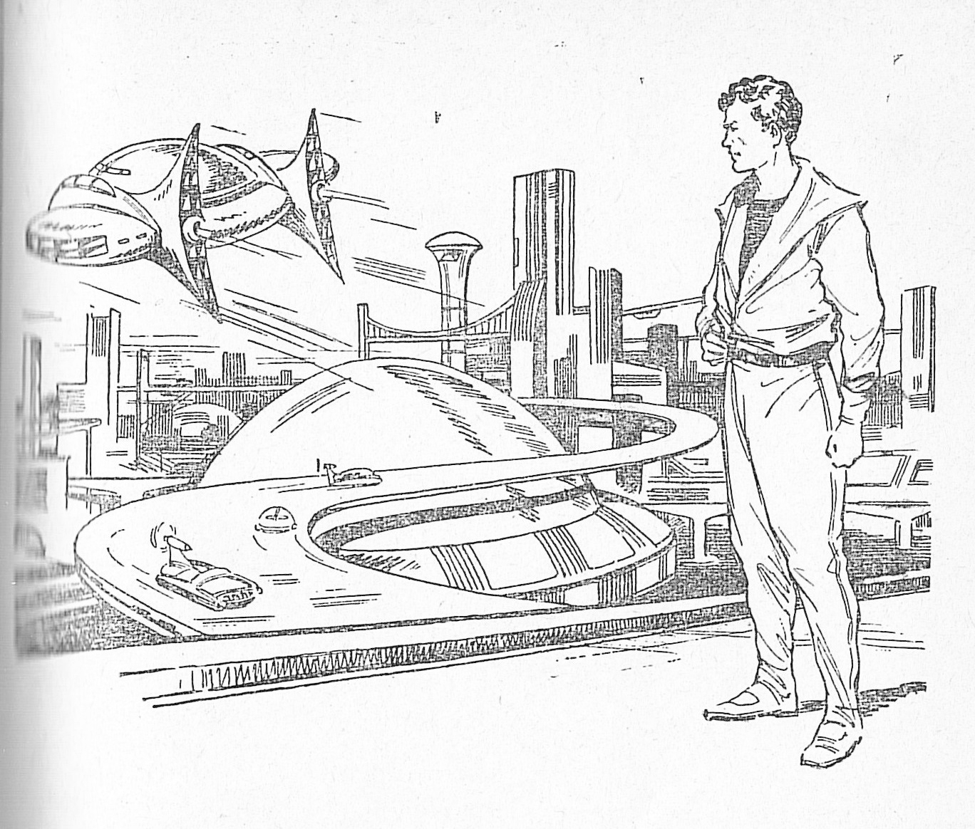 Следующие изображения иллюстрируют эволюцию представлений о высокотехнологичном будущем. Подчёркнуто футуристический, машинный город с обязательными небоскрёбами, парящими над землёй развязками и стремительными летающими машинами на рисунках 63-го года. В 97-м же достаточно угловатого, но небольшого, а значит — удивительно мобильного птерокара. Цветы, в зарослях которых тонут ноги Кондратьева, лишний раз свидетельствуют в пользу изменений визуализации городского ландшафта будущего. У Стругацких, кстати, так и написано: "город тонул в зелени".