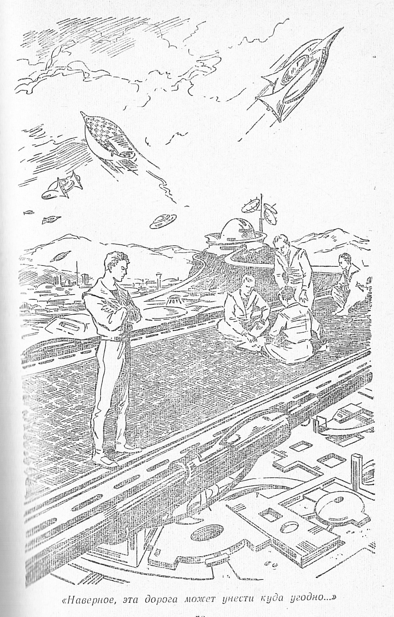 Производственный процесс будущего из рассказа "Самодвижущиеся дороги" показан абстрактно и непонятно. Таков и авторский замысел: сбитый с толку Сергей Кондратьев завороженно вглядывается в накрытую прозрачным колпаком котловину и про себя называет её "адом". Рутинная работа, давно освоенные технологии по мнению человека из прошлого — нечто ошеломляющее.