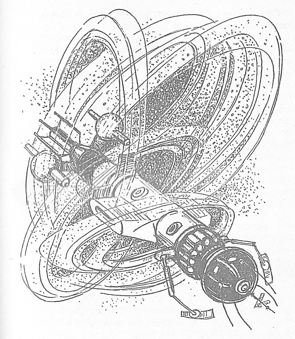 Покинутый Странниками Спутник из рассказа "Десантники" представляет собой классическую тороидальную станцию, каковой, судя по тексту, и является. А вот атомный планетолёт "Скиф-Алеф", на котором Горбовский и его команда спускались в бешеную атмосферу Владиславы, больше напоминает обычный реактивный истребитель. Впрочем, почему бы и нет? Вполне подходящая форма. Корабль, изображённый на иллюстрации 97-го года, ни тем ни другим быть не может по определению: это не тор, а для полётов в условиях атмосферы у него слишком необтекаемая форма. Значит, это "Тариэль" — шестикилометровый Д-звездолёт Горбовского.