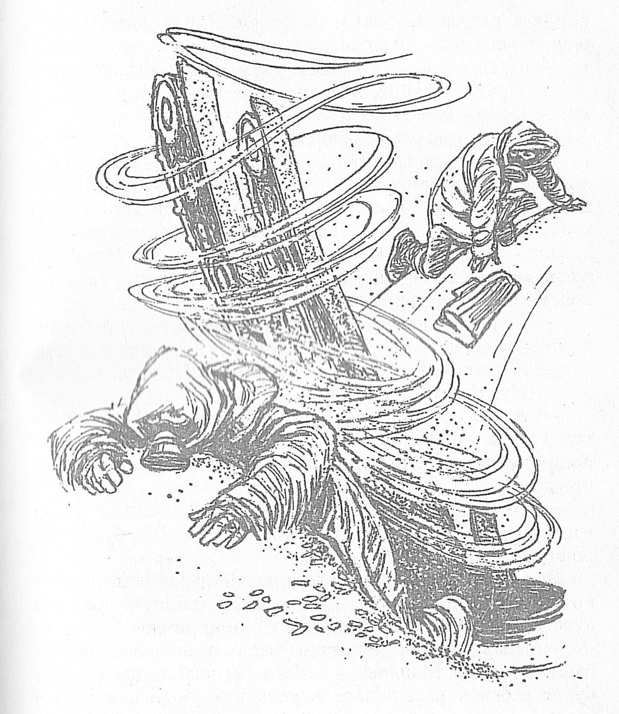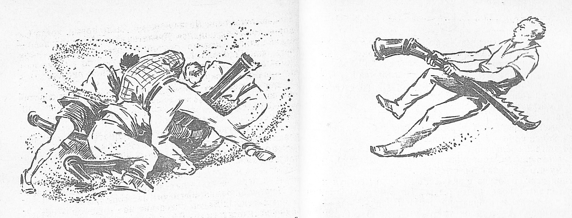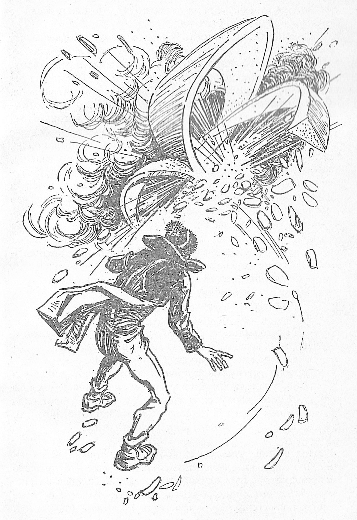 Эта внутренняя отчаянность угадывается и на иллюстрации 97-го года, на которой изображён момент взрыва. Бесстрашный Атос бросается в самый эпицентр. На рисунке 67-го года, надо полагать, стажёры Сорочинский и Гальцев, которым Сидоров не разрешил спускаться в воронку.