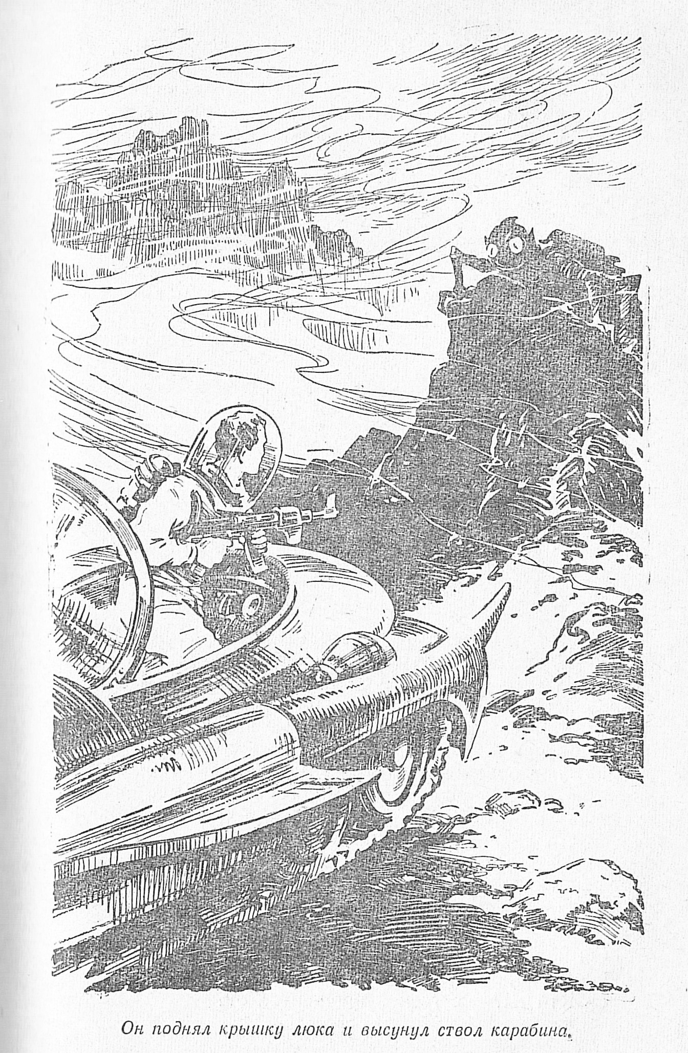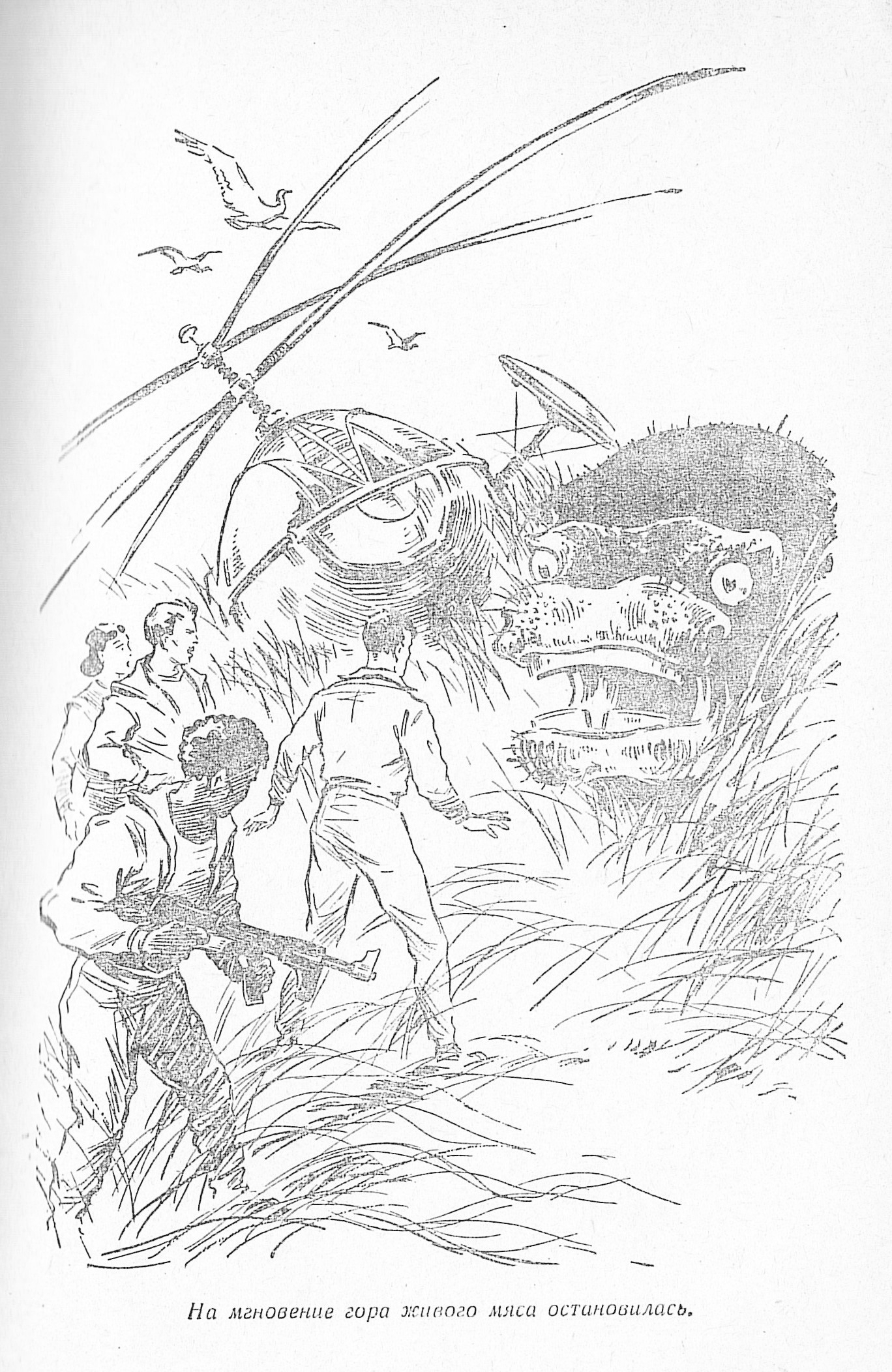 Бедный "бегемот" из рассказа "Благоустроенная планета"! Ещё мгновение — и ему конец. Первые две иллюстрации опять выглядят как последовательность кадров из одной и той же постановки. Только Мбога поменял позицию, приготовившись к выстрелу.