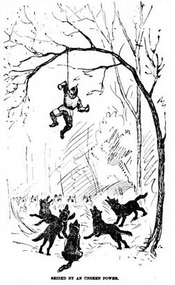 Бедный маленький барон теперь считал себя погибшим, но отчаянно пнул зверя правой ногой, на которой надежная среднеанглийская защита оставалась нетронутой, и перебрался за дерево, где согнутый ствол, казалось, обещал опору его спине, пока он делал все возможное в своей безнадежной борьбе; и когда он вытянул руку вперед и приготовился к следующему, возможно, последнему штурму, он внезапно почувствовал, как его руку чудесным образом схватила какая-то невидимая сила, которая дернула его на 20 футов в воздух и задержала его висящим на высоте около 15 футов над снегом, а внизу кружились изумленные волки, неспособные понять внезапное и необычное изменение ситуации. Но это легко объяснялось: барон попал в одну из ловушек, которые старый Сигрол расставил для самих волков.