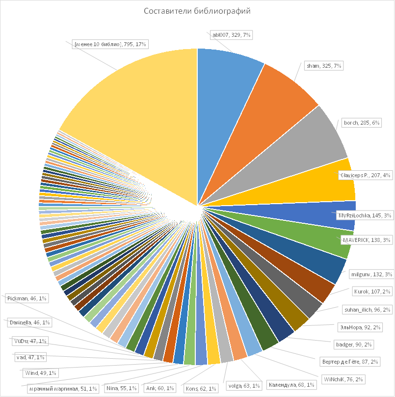 На круговой диаграмме (увеличивается по клику) представлено распределение библиографий открытых авторов между составителями. Метки содержат логин составителя, число библиографий, в составлении которых он участвовал, и процент этого числа от общей суммы. Незарегистрированные на Фантлабе составители не учитываются. Общая сумма больше числа открытых авторов, поскольку у части библиографий было несколько составителей.
