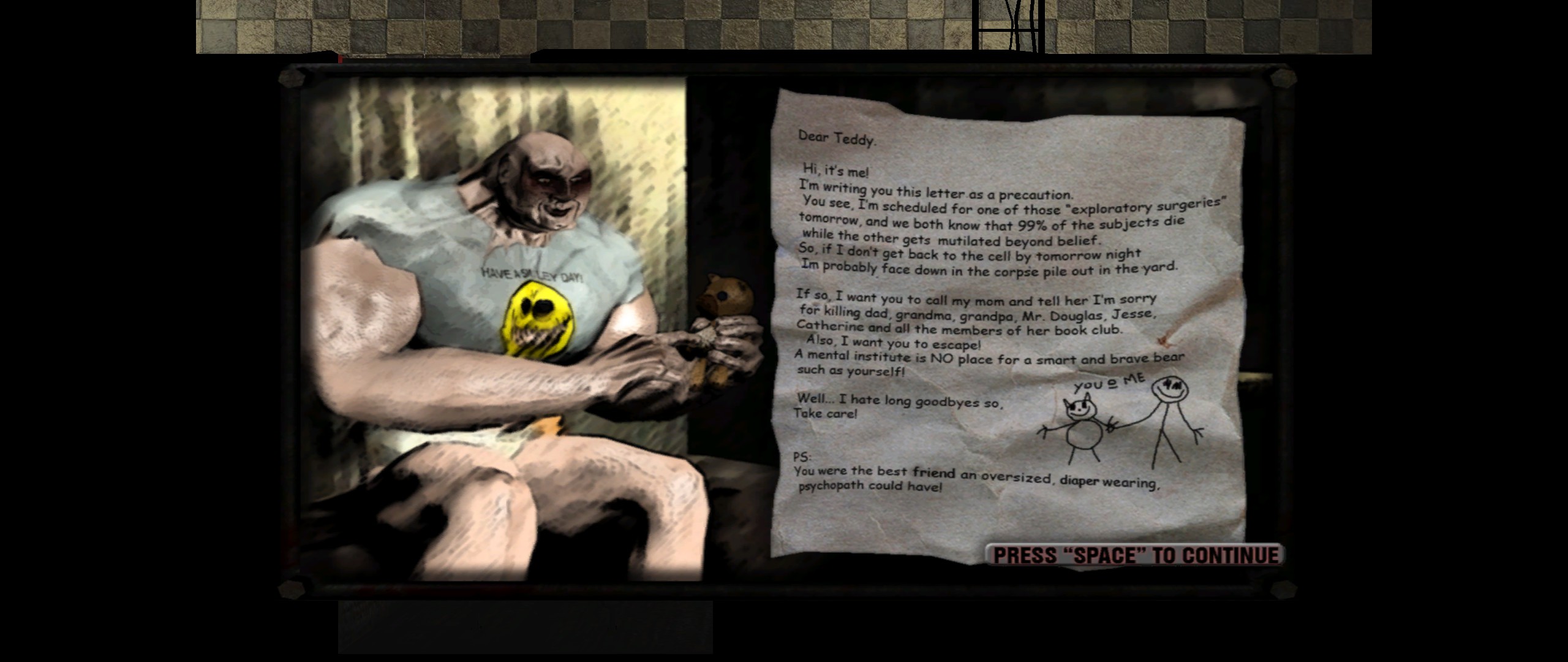 Действие игры происходит в наши дни в закрытой психиатрической клинике Блэкбэй, куда накануне перевели опасного психопата, умственно отсталого убийцу Дуга Данахью, который носит подгузник и не расстается со своим плюшевым мишкой Тедди. Дуг очень милый, правда, за образ главного героя парням из TAD Productions можно ставить плюс. Клиника расположена в 8 морских милях от печально известного Иннсмута. Здесь проводятся какие-то секретные опыты над заключенными, но прямо перед операцией, после которой Дуг вряд ли бы выжил, происходит ЧП — охранные системы отключаются, надзиратели и персонал куда-то исчезают, а в коридорах нам повсюду встречаются огромные лужи крови и оторванные конечности. Наша цель — найти выход из лечебницы и обрести долгожданную свободу.