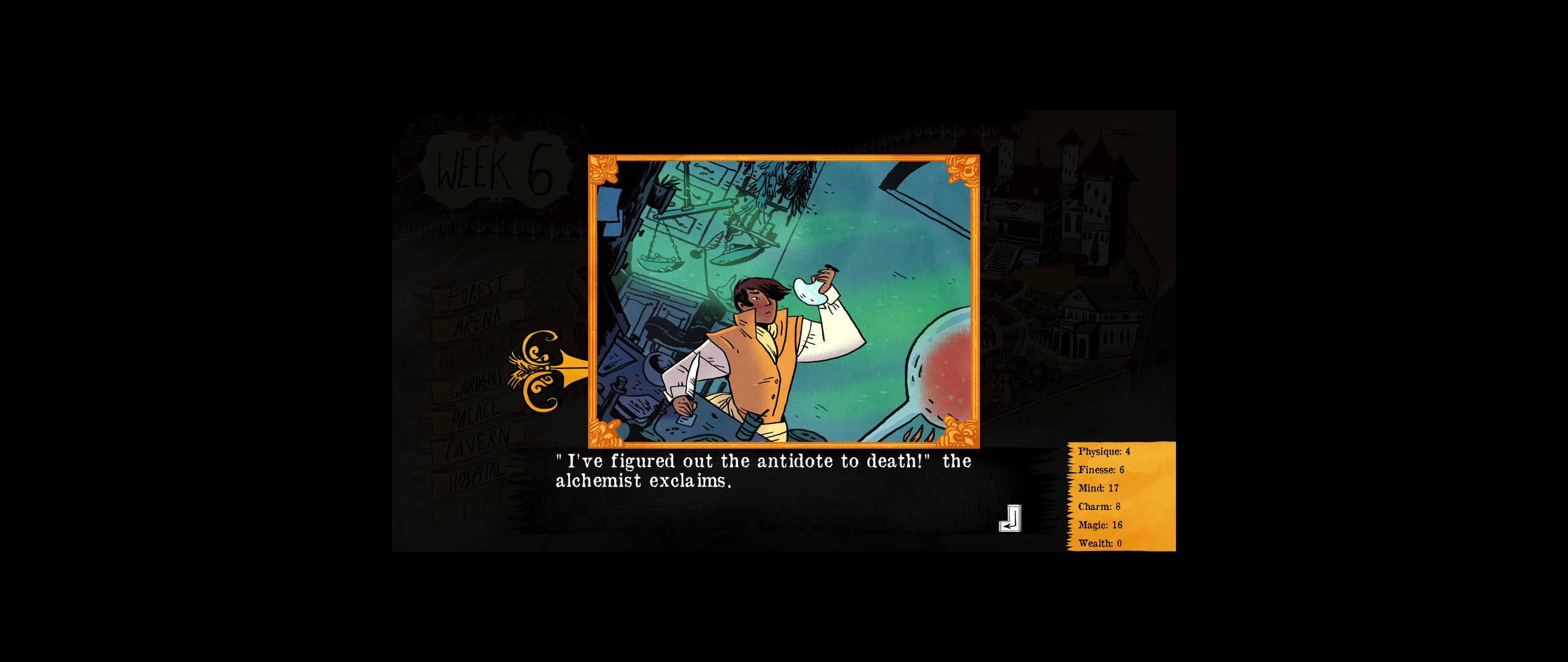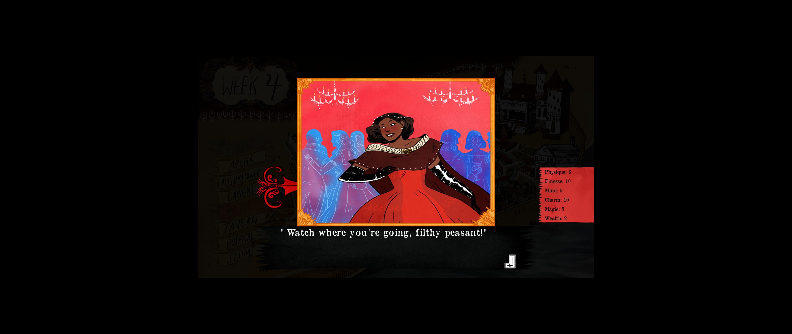 Перед нами открывается панорама города, в свой ход каждый персонаж может выбирать где ему провести очередную игровую неделю — выбор простирается от леса и садов до дворца, госпиталя и трущоб. В каждой локации доступно 2 активности на выбор — например, на арене можно либо участвовать в поединках, либо делать ставки. По окончании недели мы получаем прирост к параметрам (сила, магия, харизма и т.д.) а также обязательно происходит рандомный ивент, во время которого нам предстоит выбирать свои действия и от этого будет зависеть получим ли мы доп. баллы характеристик или напротив потеряем их. Во время рандомных ивентов происходит проверка уровня навыка — это означает, что если у вас идет проверка, к примеру, на магию (скажем, вы выбрали вариант кастануть фаерболом в толпу живых мертвецов), а этот параметр у вас равен дефолтным пяти баллам, то проверку вы провалите и огребете негативные последствия.