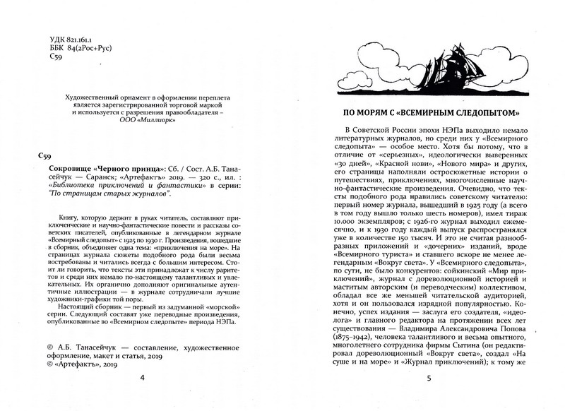 Сообщаю о выходе сборника «Сокровище “Черного принца”», составленного из остросюжетных «морских» приключенческих и фантастических произведений советских писателей 1920-х гг., опубликованных с 1925 по 1930 г. на страницах замечательного журнала «Всемирный следопыт».