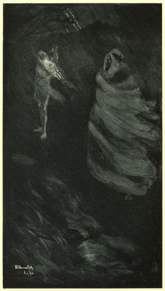 На мгновение приостановившись в замешательстве, какое направление следует избрать, закутанный странник различил вдруг неподалёку человеческий силуэт, ещё более странный, чем его собственный, что был частично скрыт водным потоком и мог в любой момент быть либо заваленным, либо раздавленным насмерть падающими сверху обломками. В спешке, что угрожала его жизни, таинственный странник схватил несчастного безумца и оттащил его от разрушительного течения, и как только это произошло, опустил его наземь неподалёку от пещеры, которой раньше не приметил. “Не прикасайся ко мне!” – возопило тут спасённое существо голосом, который поразил его спасителя. Хотя в сравнении с остальными частями его индивидуальности, этот голос был наименее отталкивающим в его внешности. Перед халифом стояло лысоголовое существо, согнутое возрастом, бледное как привидение, истощённое будто от жестокого голода, морщинистое как древняя карга, косматое как медведь, борода же его спускалась до самых колен, а волосы – до талии. Смерть глядела из его глаз, убогость – из лица его; всё вместе создавало образ безнадёжности, бредущей навстречу могиле; едва имея силы переставлять свои конечности, этот негодяй проковылял в лишённую света дыру, скуля и подвывая.