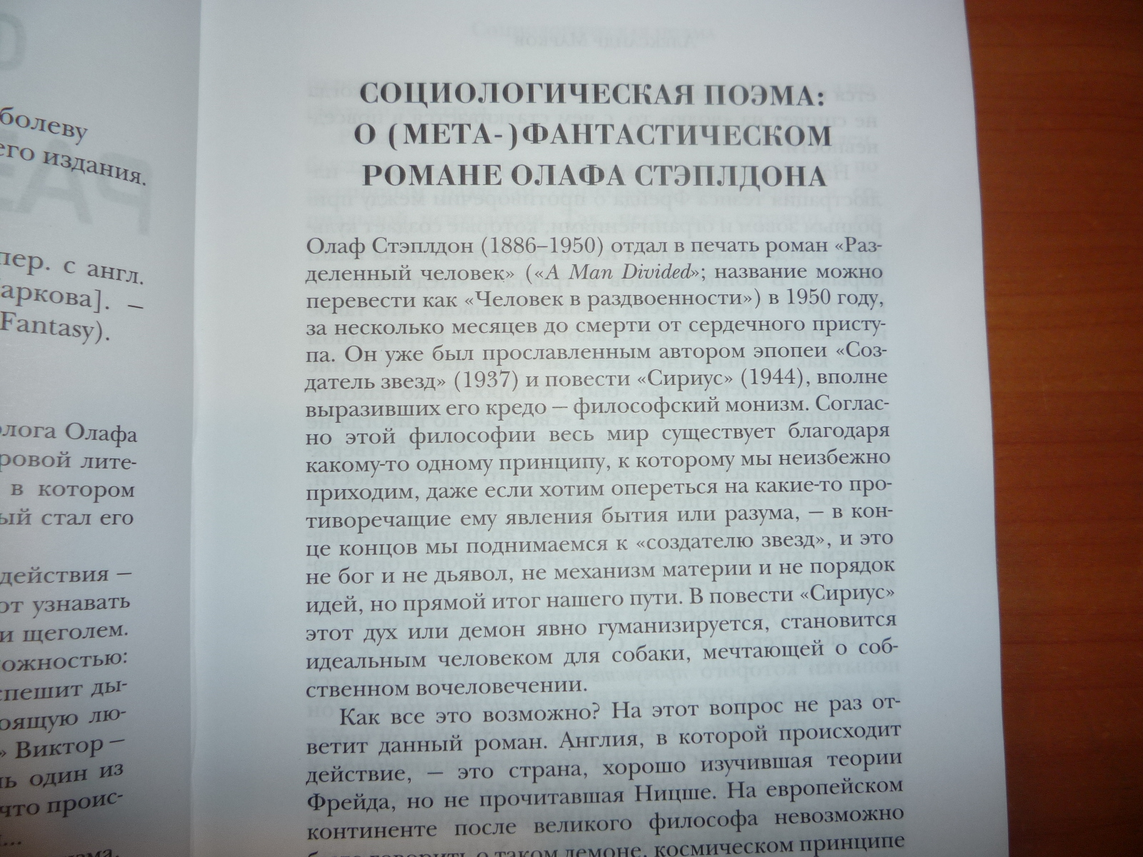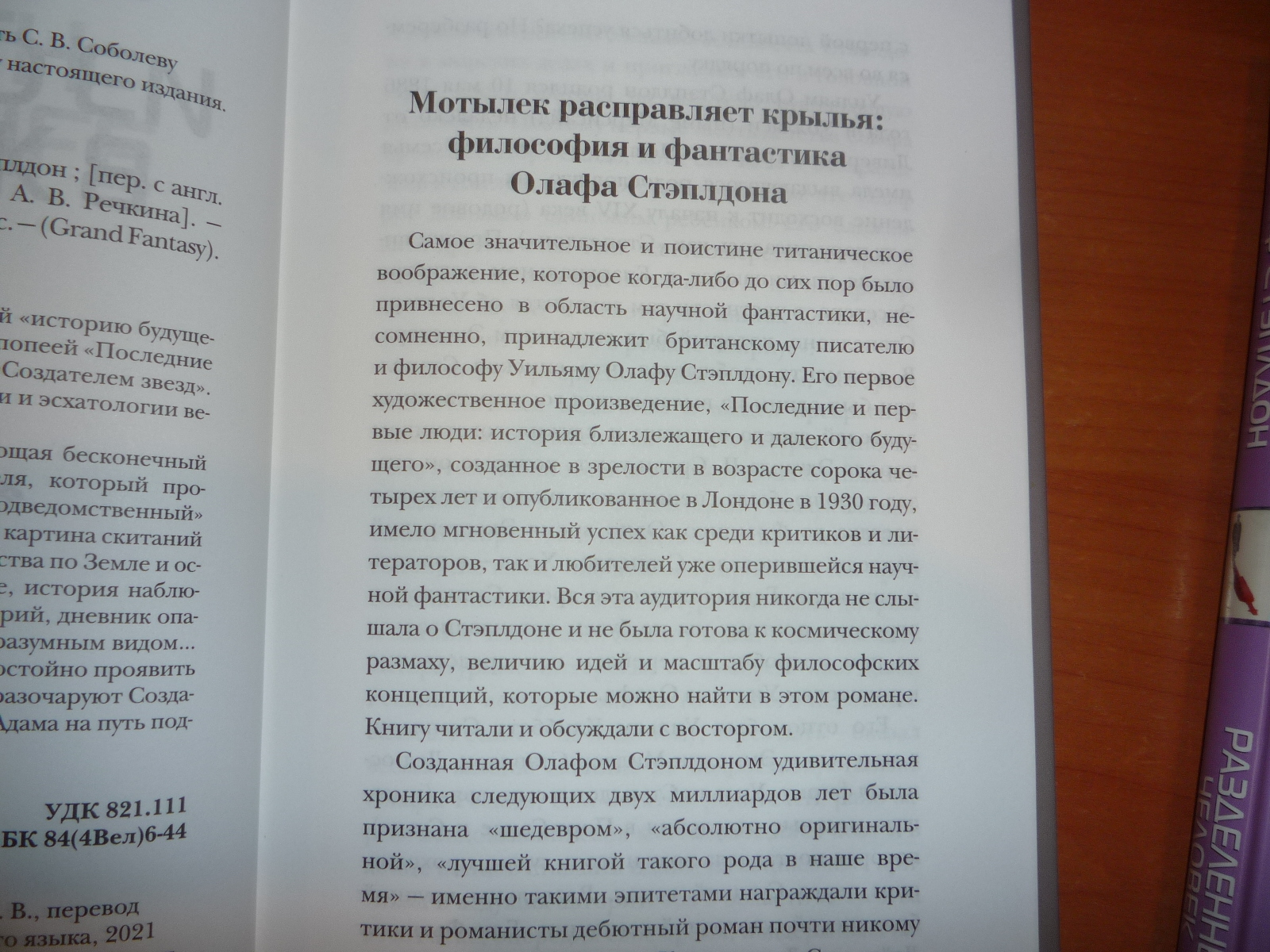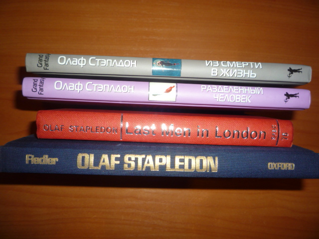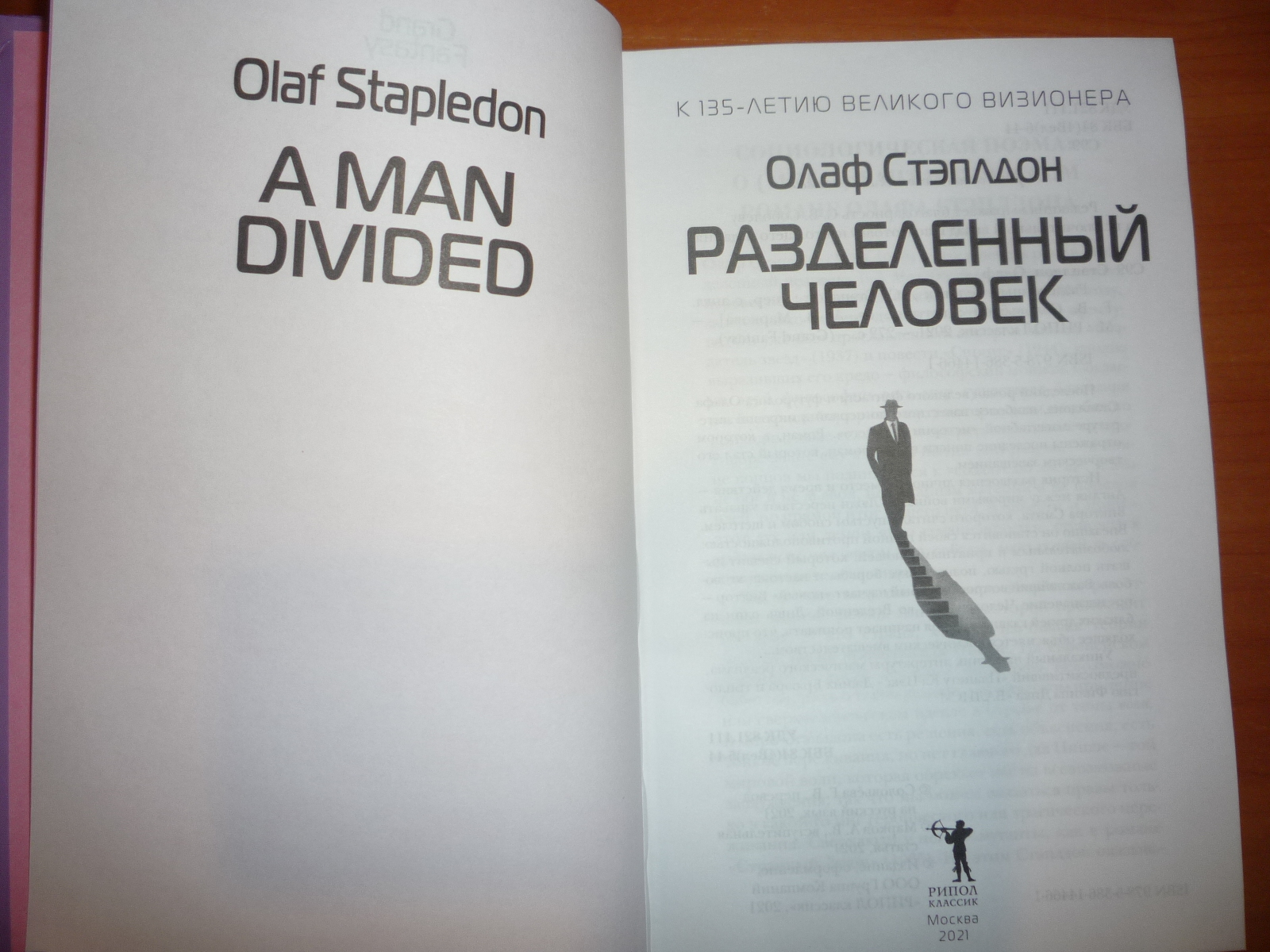 В серии "Grand Fantasy" издательства Рипол вышло два романа английского писателя-фантаста О.Стэплдона — "Разделенный человек" и "Из смерти в жизнь". Переводы известные, Галины Соловьевой, но в этот раз книжки предваряются послесловиями — на шесть страниц предисловие А.Маркова к первому роману, и ко второму — А.Речкина большая статья на 30 страниц. Я боялся что книги будут как от Т8, но нет — ладный скругленный корешок, белоснежная бумага, тонированный форзац. Плюс предисловия — ценное дополнение, романы-то эти у меня давно имеются в библиотеке. Надо будет присмотреться к серии, там обещаны к выпуску еще несколько книг других классиков (Моррис, Говард).
