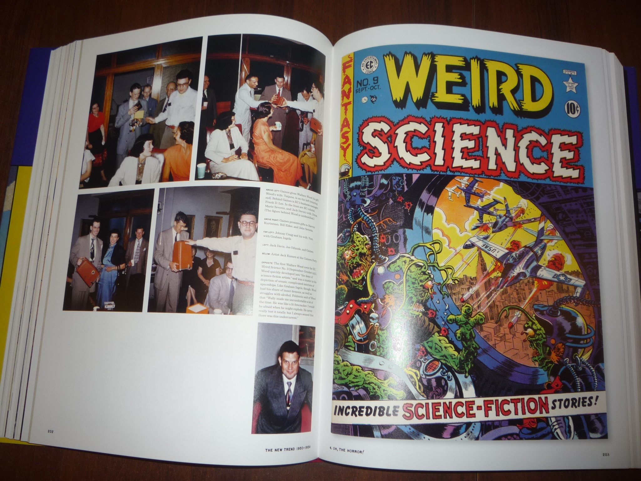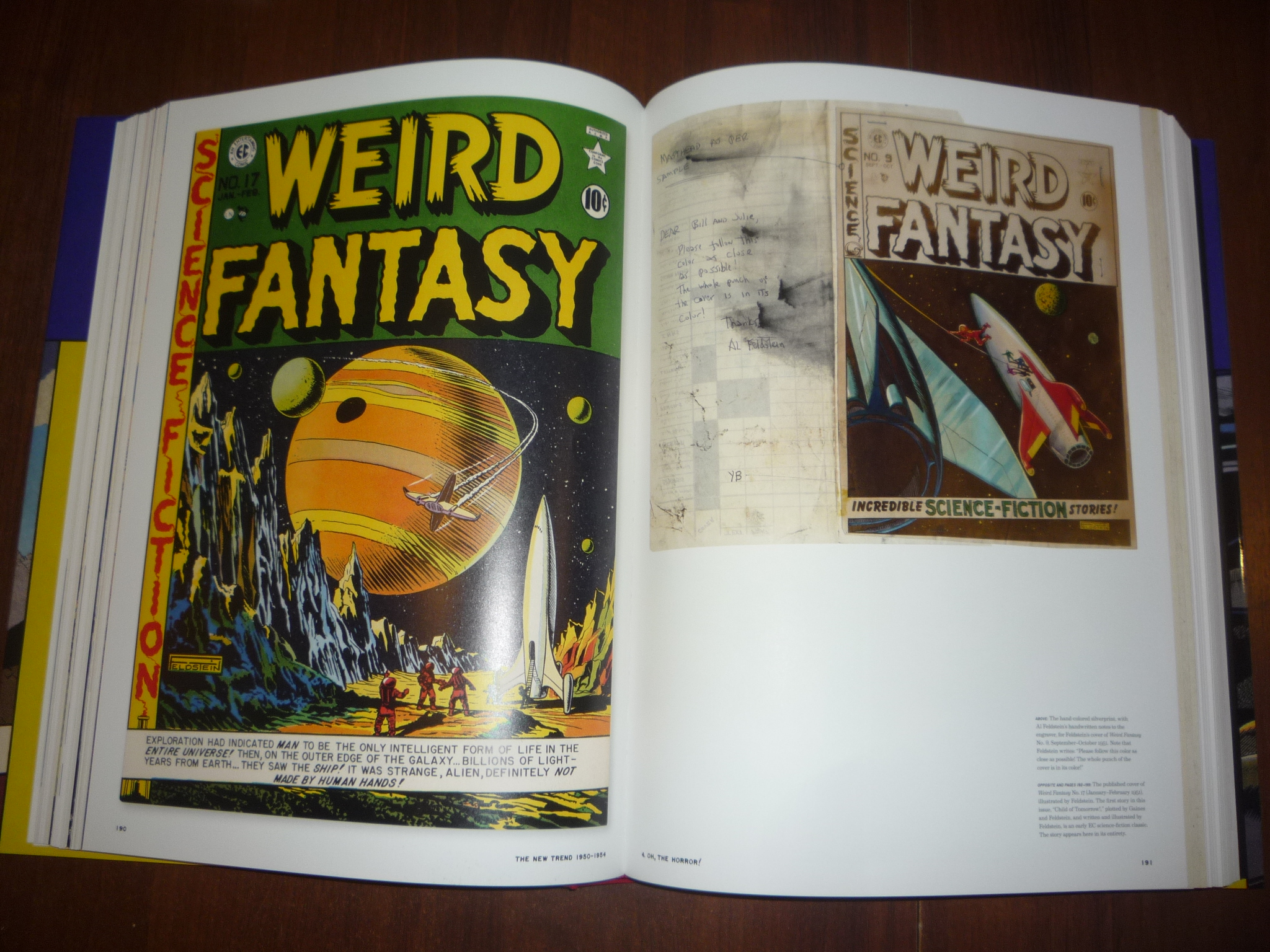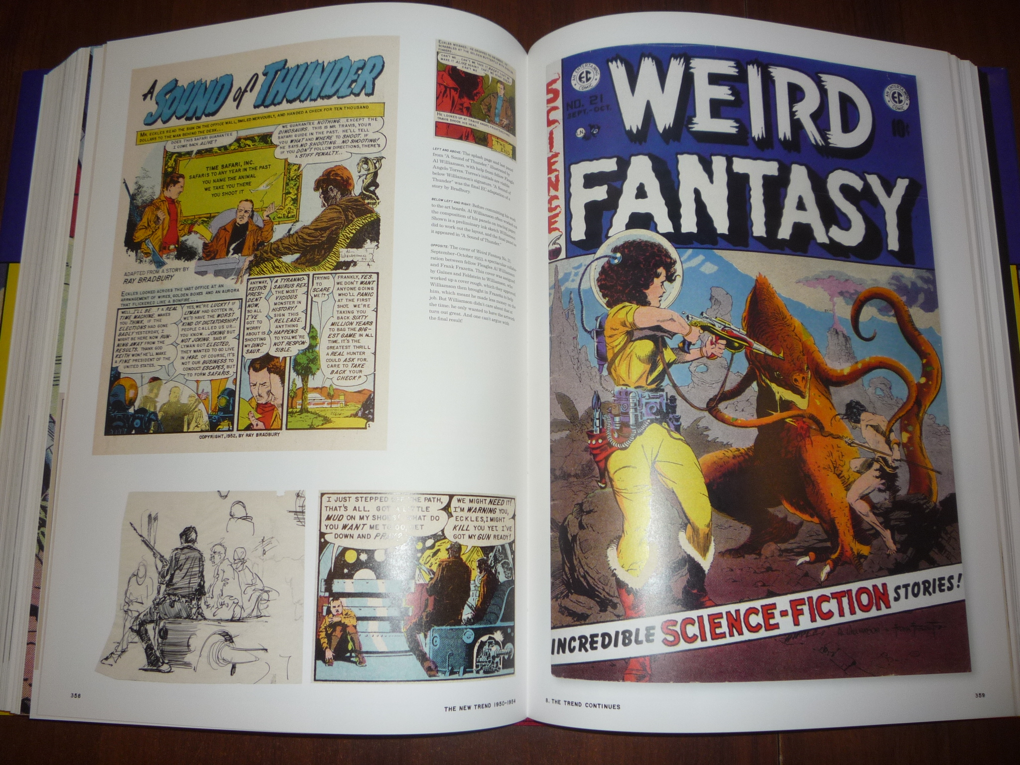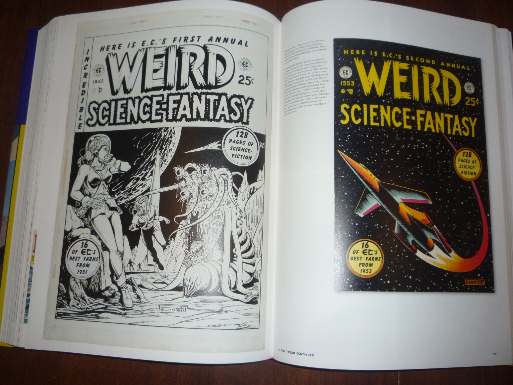 Перед нами одна из его свежих работ: "История комиксов фирмы ЕС", выпущенная издательством Ташен в сентябре 2020 года. 592 страницы, размеры книги впечатляют: 30 на 40 см, вес 6 килограмм без нескольких граммов. Более тысячи иллюстраций, около ста редких изображений выуженных автором из архива семьи издателей фирмы "Образовательные комиксы" (ЕС — это Educational Comics). Книга охватывает период с 1933 по 1956 год, описывает оба периода в жизни фирмы — 1933-1947, когда М.С.Гейнс печатал обучающие истории и адаптации классики, и период 1947-56, когда руководить издательством стал сын, Уильям Гейнс. Вот тут-то и понеслось: Гейнс-младший разрешил художникам подписывать свои работы чтобы читатели различали авторов и голосовали за лучших иллюстраторов, Гейнс-младший открыл двери для лютых форматов — для ужастиков, мистики, научной фантастики. Вопросов гонораров я не изучил, но в ЕС пришли молодые таланты: Франк Фразетта, Валли Вуд, Эл Фельдштейн, Харви Курцман, Рид Крэндалл. Каждый из этих художников породил целые полчища поклонников, эпигонов, продолжателей и внёс своё вклад в визуализацию фантастики как жанра. Поразительно, все они небольшое время, буквально несколько лет, работали в одном издательстве. Закат фирмы связывают с оголтелостью Маккартизма-антикоммунизма и воцарившейся после этого пуританской моралью. "Пуритане это люди, которым плохо, когда другим хорошо".