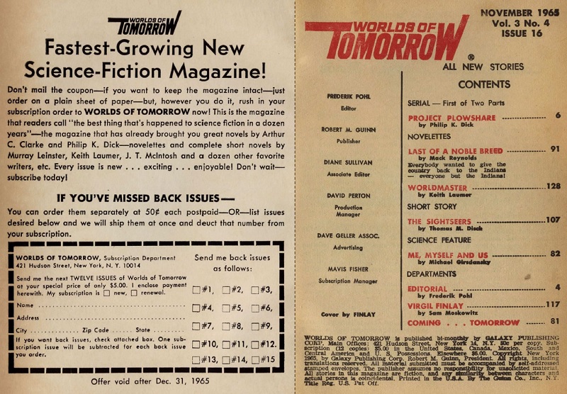 Фредерик Пол, редактор журнала Worlds of Tomorrow, напечатал начало романа в ноябрьском выпуске за 1965 год, и окончание – в январском номере за 1966. В журнале роман печатался под названием Project Plowshare («Проект Плуг», намёк на поговорку Перекуём мечи на орало), с иллюстрациями Грея Морроу.