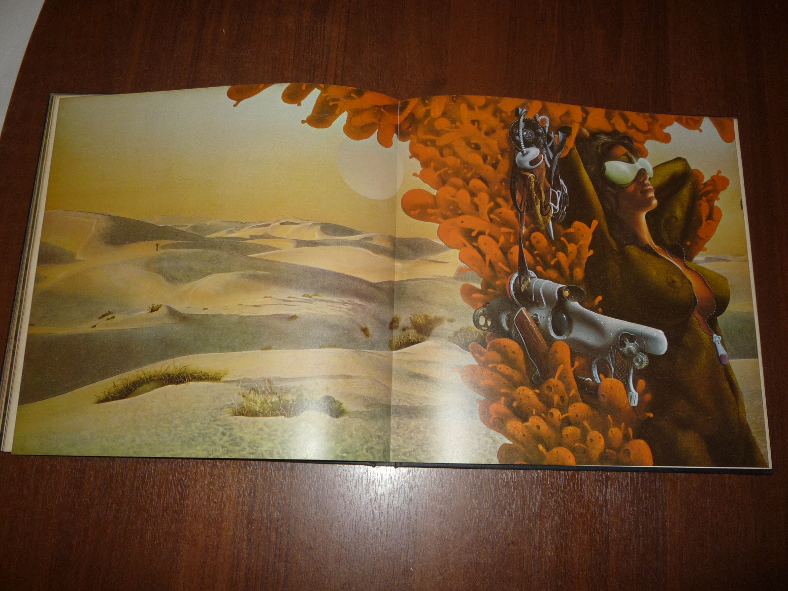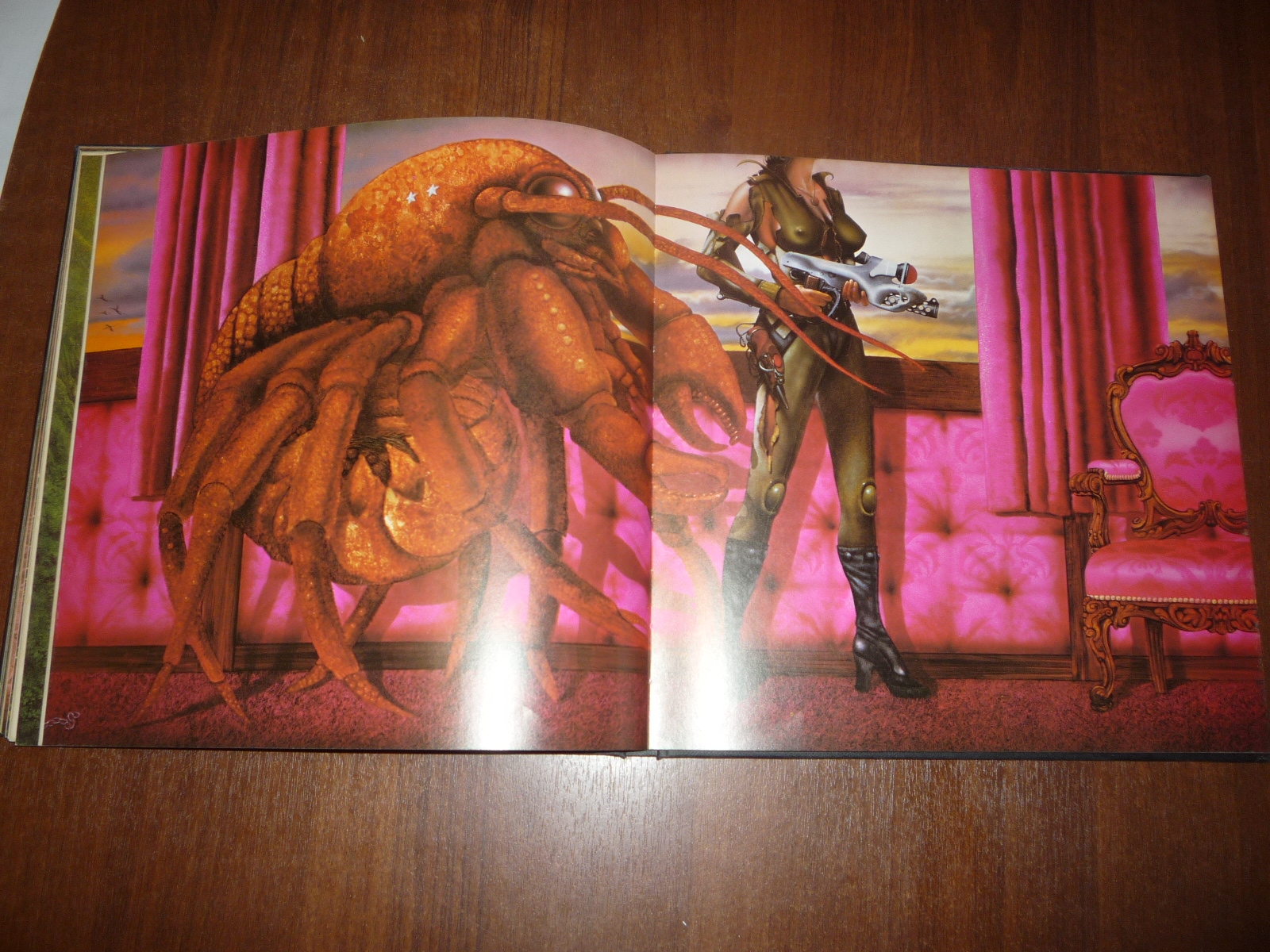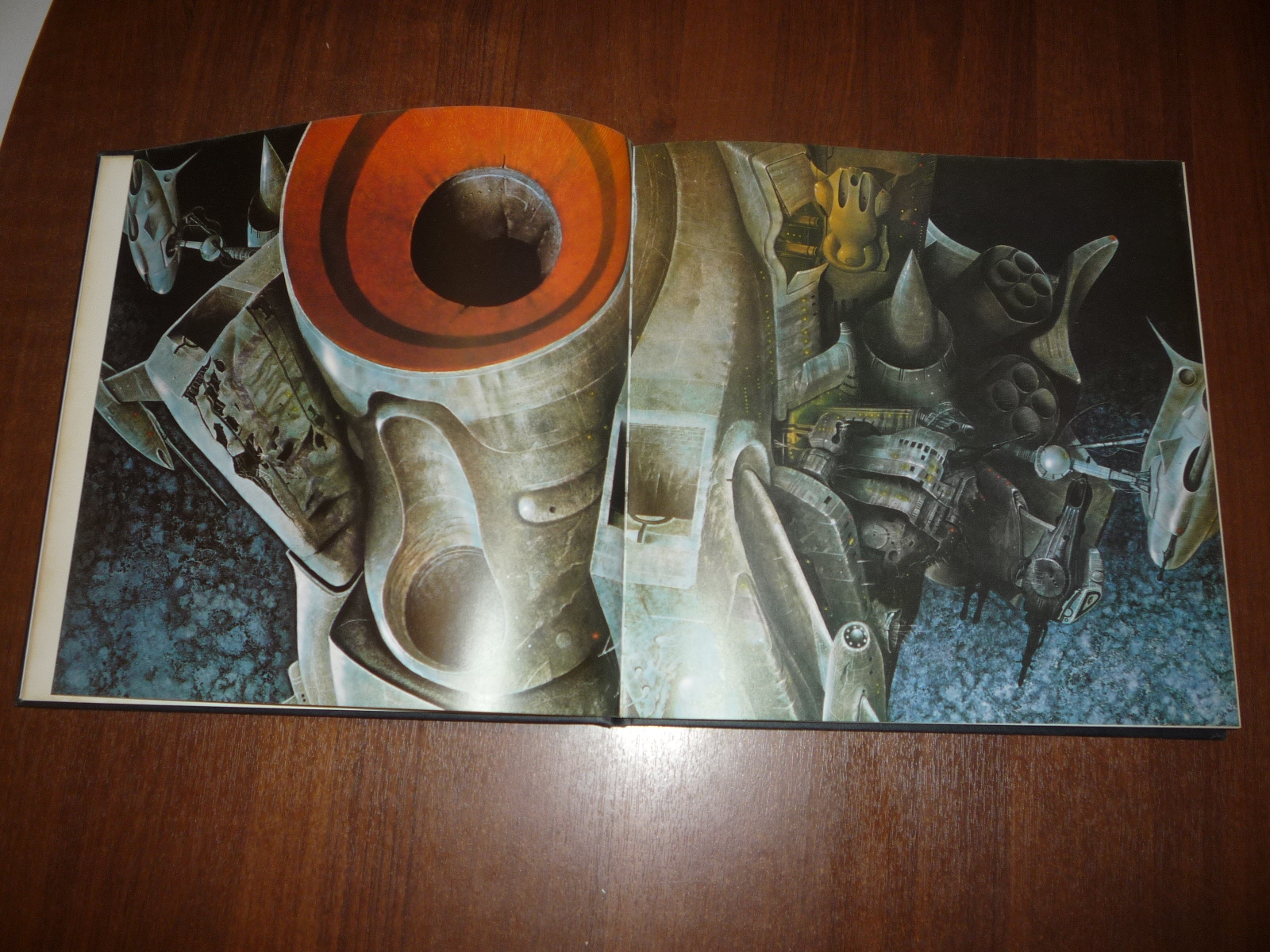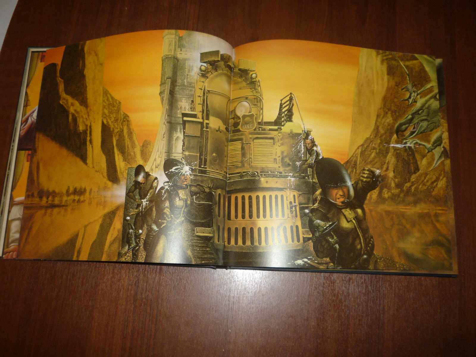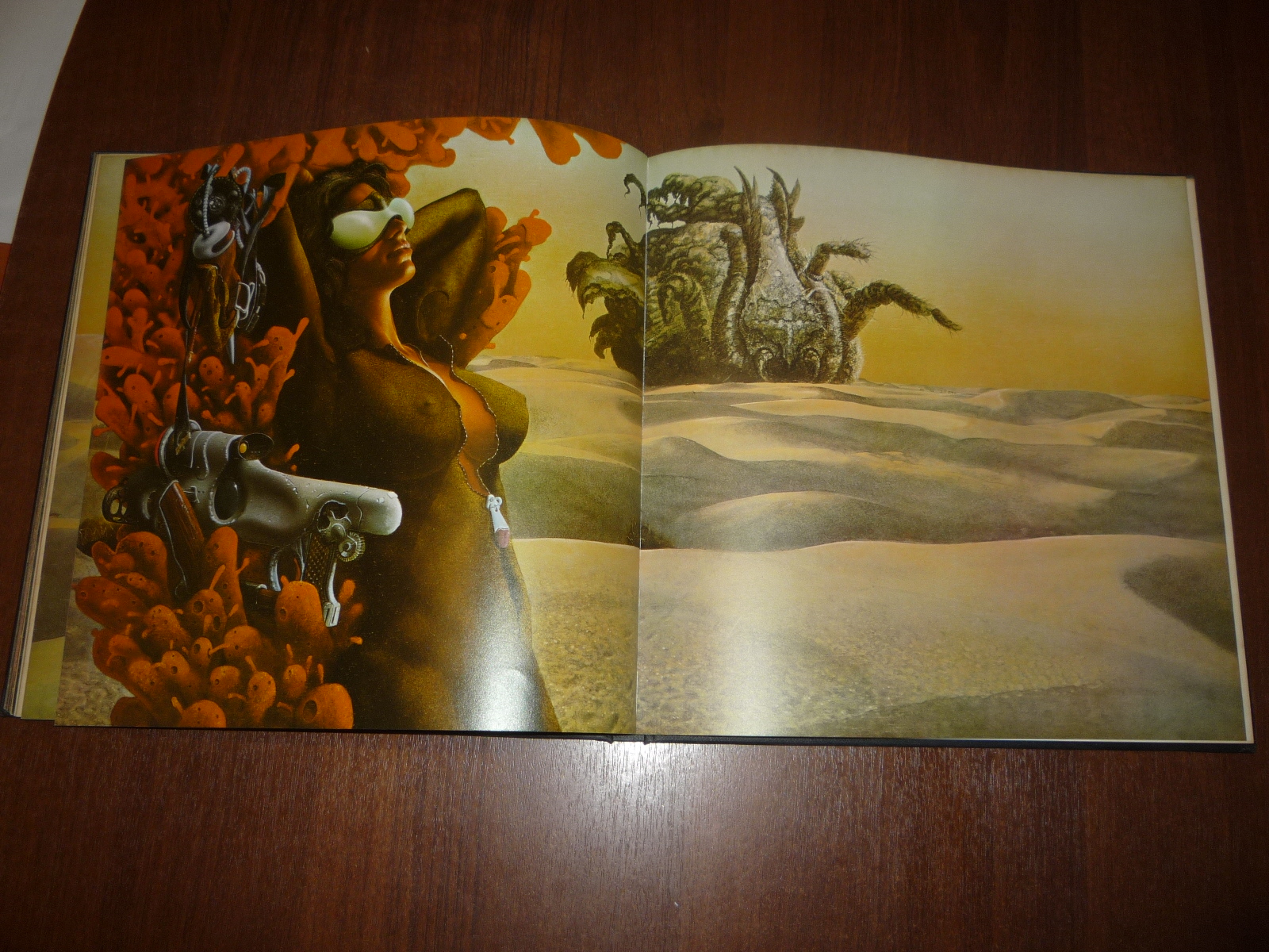 Тем не менее, заинтересовавшись изданием, в тот же день рискнул приобрести у английских букинистов английский же выпуск (книга была напечатана в мягкой обложке и твердой, по цене они сейчас практически сравнялись, 5-10 фунтов), и сегодня его уже получил по почте. Издание кстати не тоненькое — плотная меловка, картонные крышки шитого переплета, все это весит под килограмм. Книга превзошла мои ожидания. Она закономерно помещается на полку к альбомам фантастической живописи — в ней очень много фантастических полноформатных цветных картин.