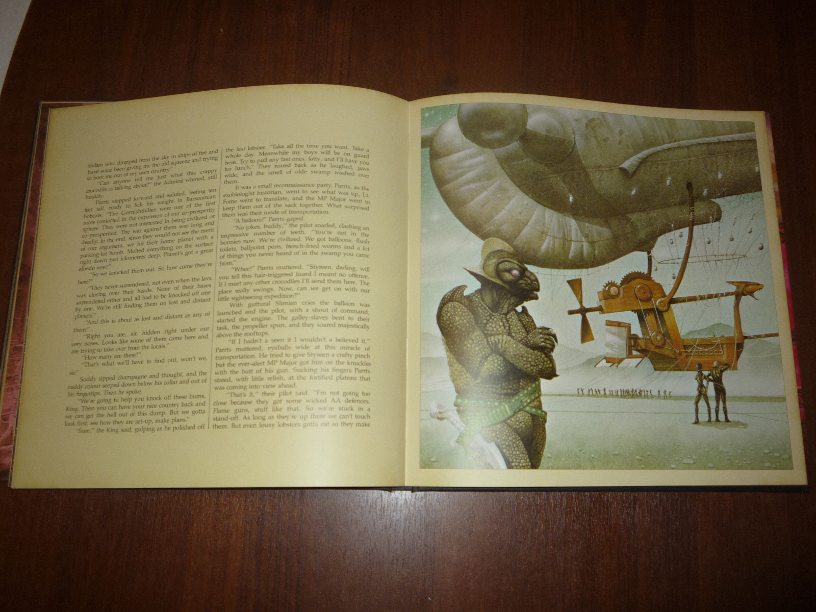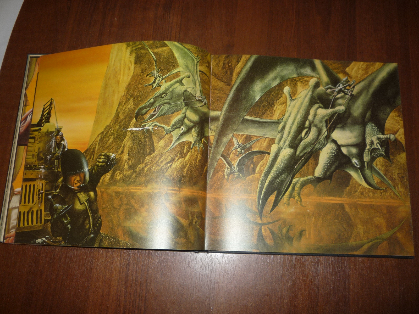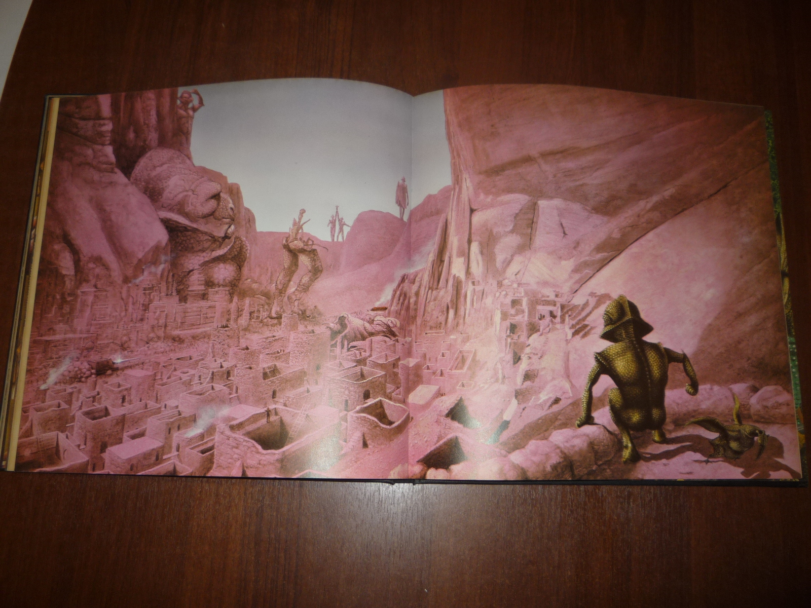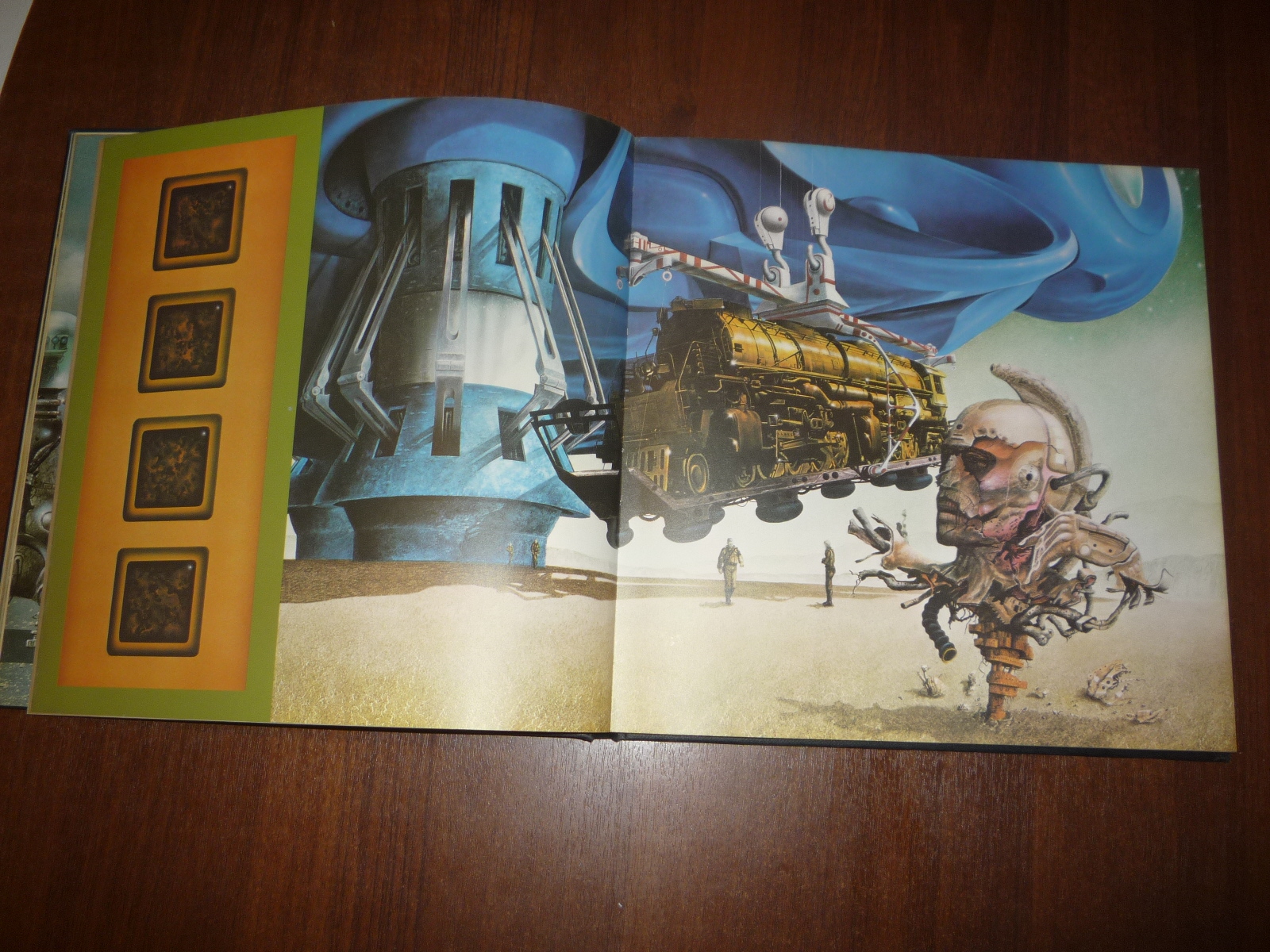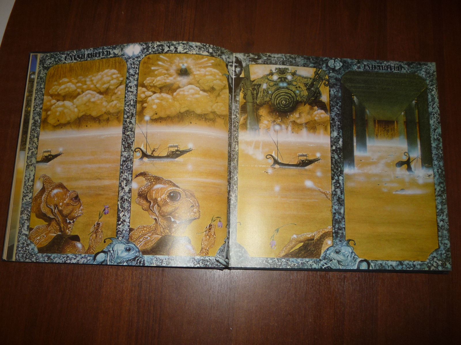 Тем не менее, заинтересовавшись изданием, в тот же день рискнул приобрести у английских букинистов английский же выпуск (книга была напечатана в мягкой обложке и твердой, по цене они сейчас практически сравнялись, 5-10 фунтов), и сегодня его уже получил по почте. Издание кстати не тоненькое — плотная меловка, картонные крышки шитого переплета, все это весит под килограмм. Книга превзошла мои ожидания. Она закономерно помещается на полку к альбомам фантастической живописи — в ней очень много фантастических полноформатных цветных картин.