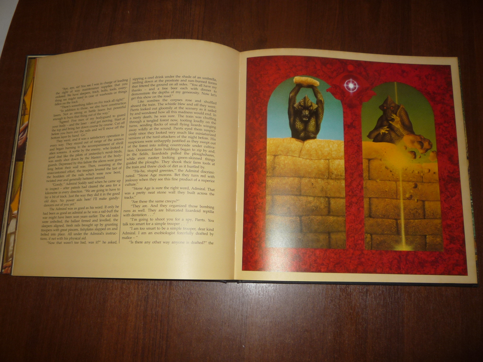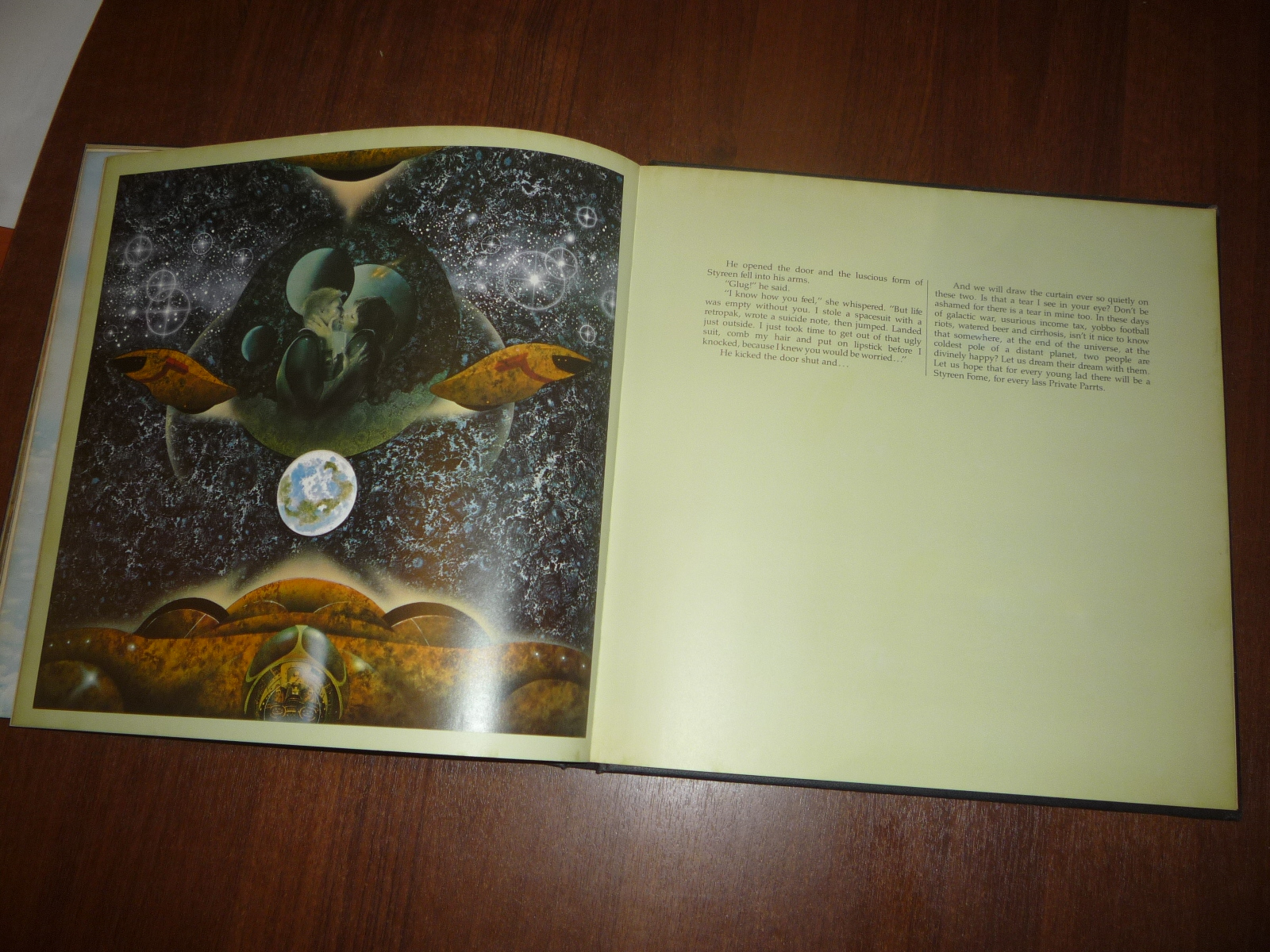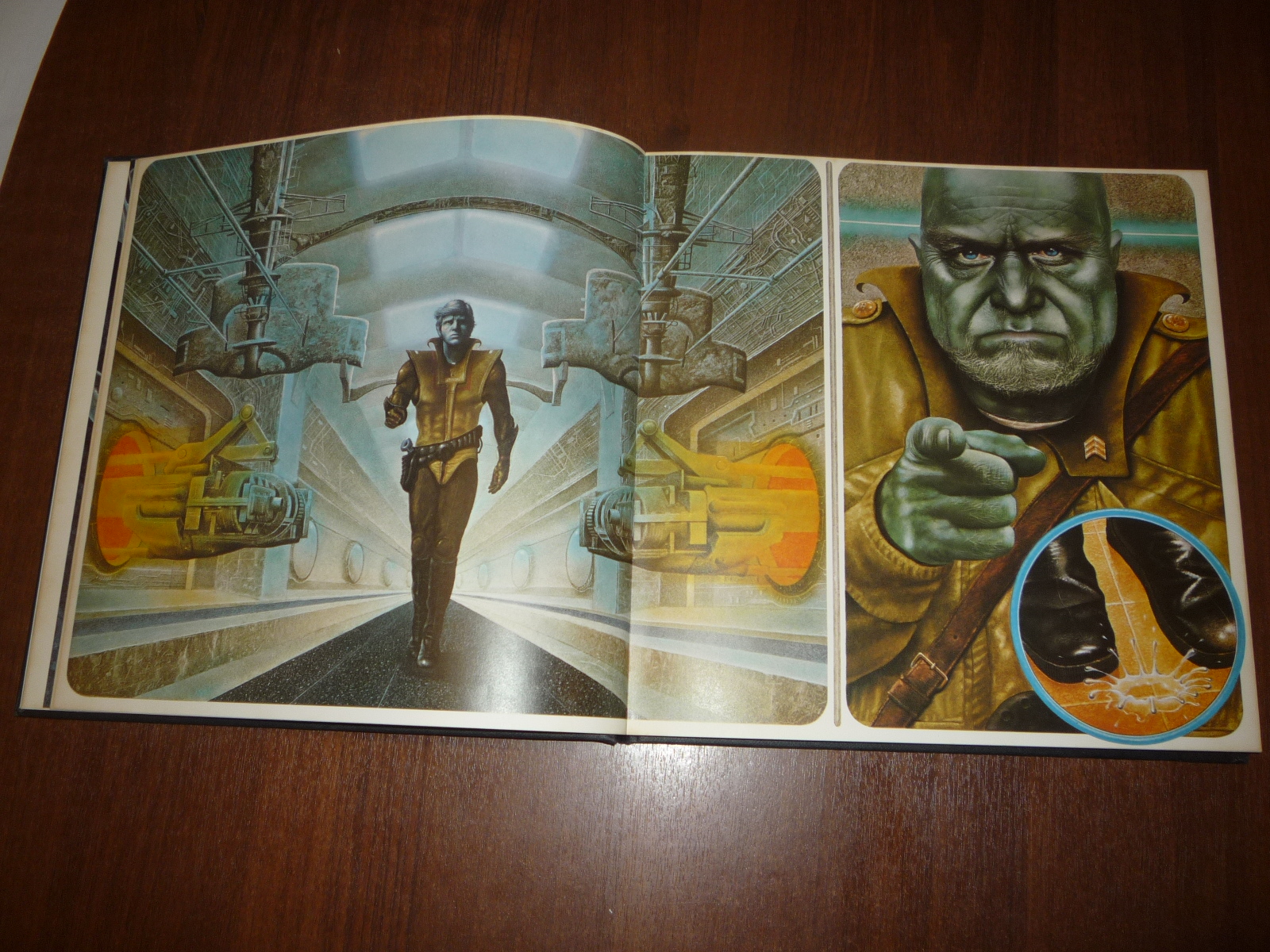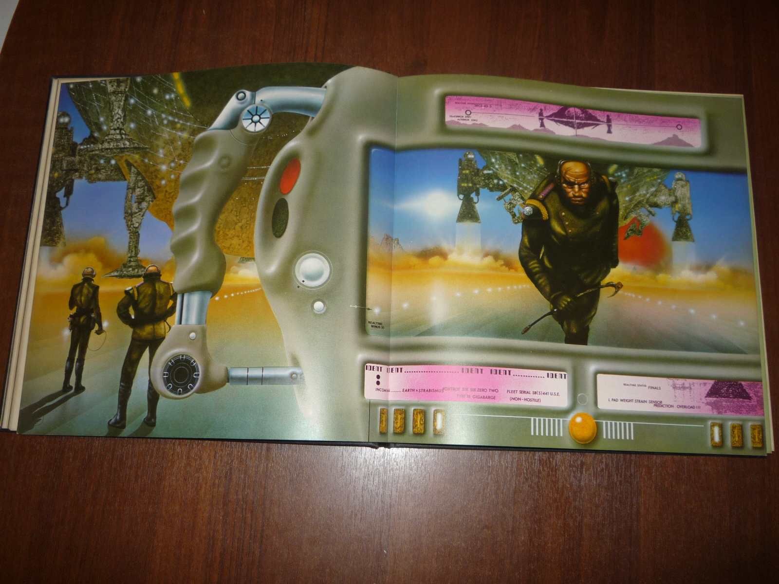 Тем не менее, заинтересовавшись изданием, в тот же день рискнул приобрести у английских букинистов английский же выпуск (книга была напечатана в мягкой обложке и твердой, по цене они сейчас практически сравнялись, 5-10 фунтов), и сегодня его уже получил по почте. Издание кстати не тоненькое — плотная меловка, картонные крышки шитого переплета, все это весит под килограмм. Книга превзошла мои ожидания. Она закономерно помещается на полку к альбомам фантастической живописи — в ней очень много фантастических полноформатных цветных картин.