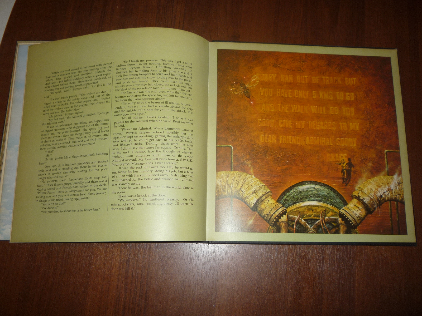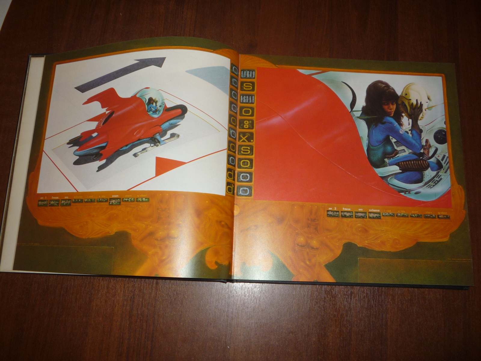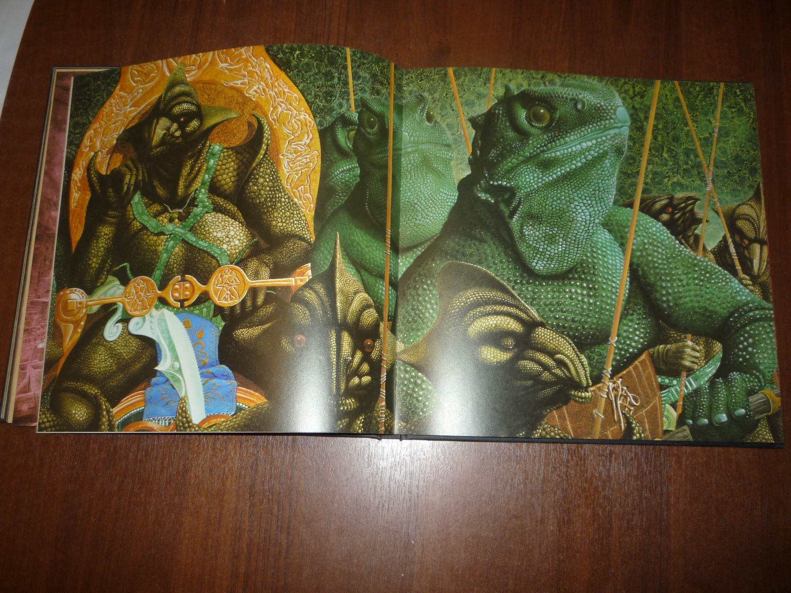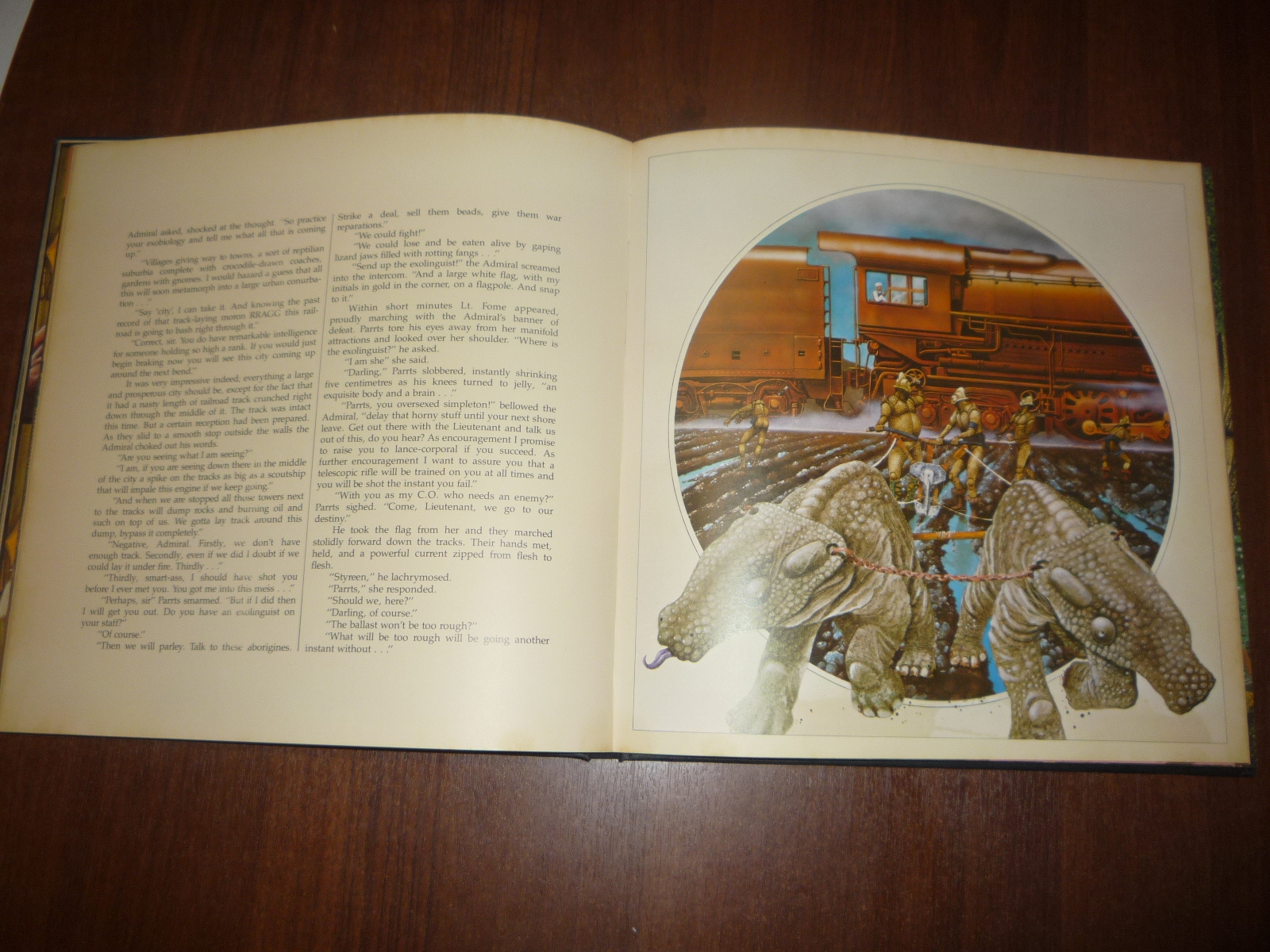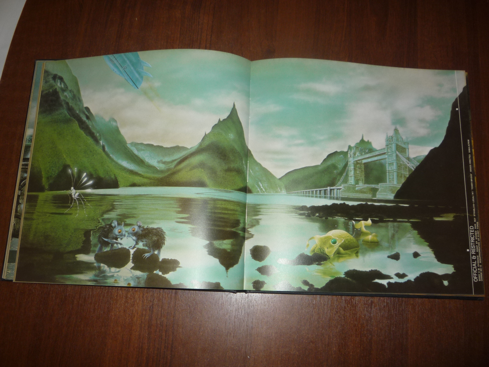 Тем не менее, заинтересовавшись изданием, в тот же день рискнул приобрести у английских букинистов английский же выпуск (книга была напечатана в мягкой обложке и твердой, по цене они сейчас практически сравнялись, 5-10 фунтов), и сегодня его уже получил по почте. Издание кстати не тоненькое — плотная меловка, картонные крышки шитого переплета, все это весит под килограмм. Книга превзошла мои ожидания. Она закономерно помещается на полку к альбомам фантастической живописи — в ней очень много фантастических полноформатных цветных картин.